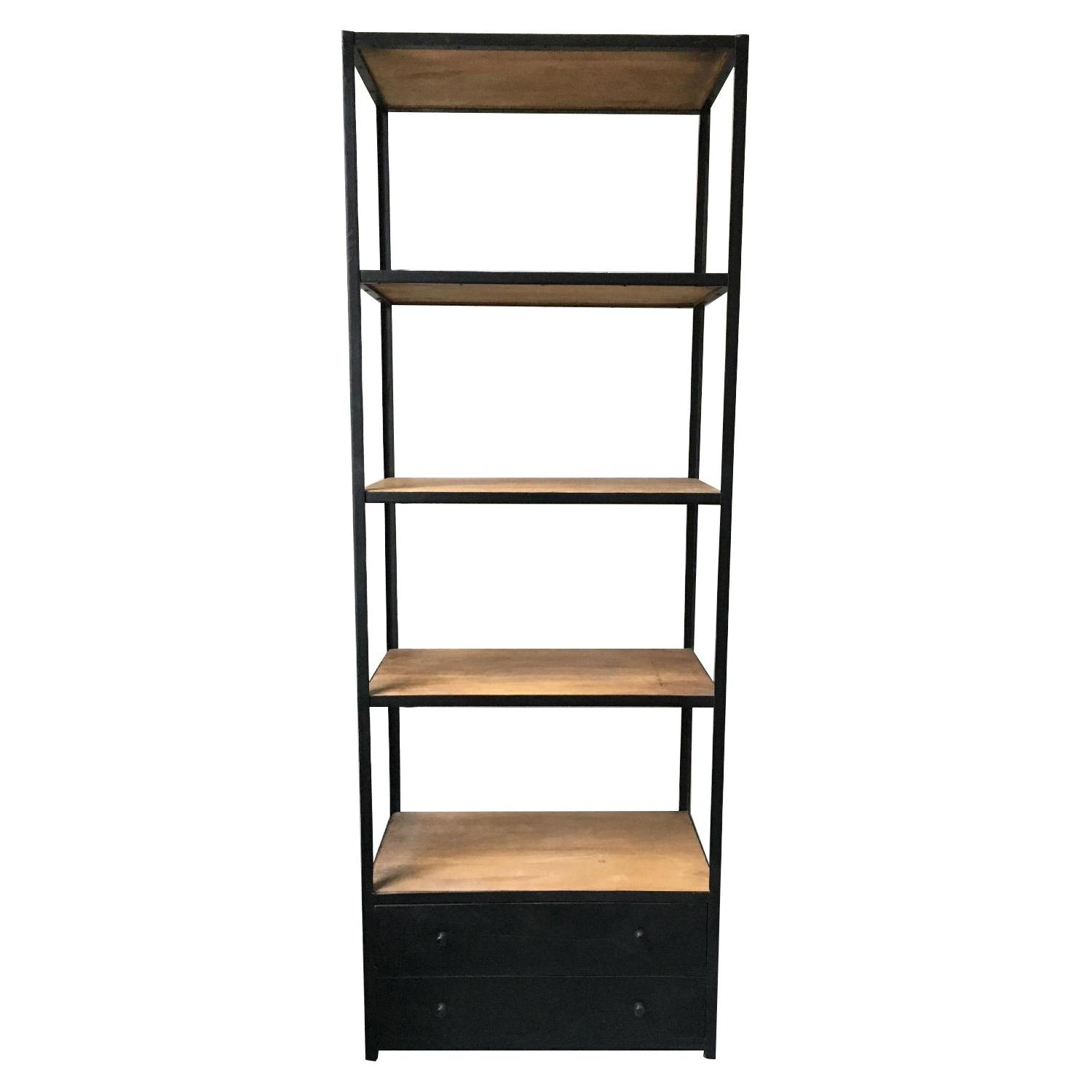 Seller's Notes:Very nice, sturdy bookcase. Steel frame with oak shelves and two drawers at the bottom. Doesn't quite fit our new apartment. Normal wear and tear on the shelves and inside the drawers, but still looks good.