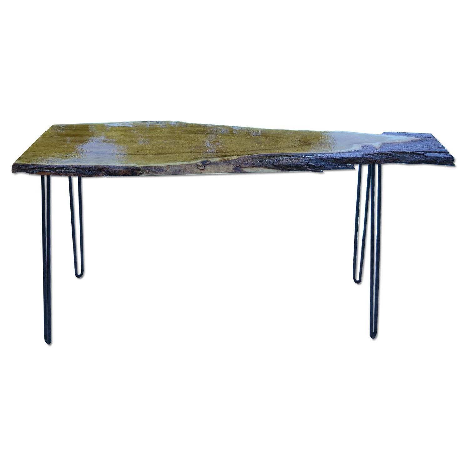 Seller's Notes:This is a handmade reclaimed Honey Locust desk/table. It's sealed on top with resin to prevent any liquid and damage from use, and sealed on the bottom to prolong the wood. Attached are the Modern Steel Hairpin legs, made by a fellow Etsy Seller. ( I love keeping small business mentality upfront and active) This is a fairly light desk for its size, but large to use or decorate in any home. It measures 54 5/8" L x 17 1/2" W x 29 1/2" H. It varies in the middle as it's width isn't constant, but live edge and natural look. It may have some minor resin imperfections on top, but unnoticeable unless looking at it quite up close.