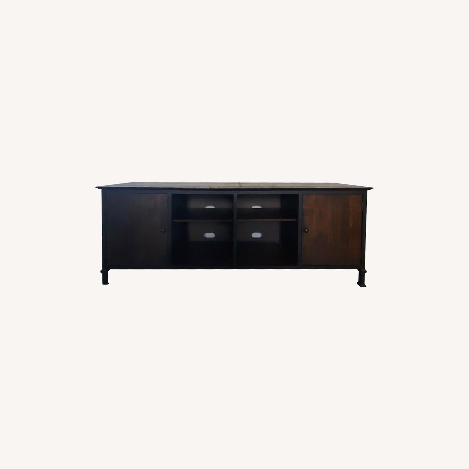 Seller's Notes:See below for details from Overstock. I have had this for about 3 years and is in relatively good shape; there is a small dent on the front top panel and a few small chips/scratches, but nothing that can't be covered up/repaired if so inclined. Details Give your rustic decor a fresh look with this Dele weathered oak TV stand From Furniture of America. With a warm wood grain finish, rough hewn accents and decorative detailing, this media center is charming as well as functional. Metal framing in a dark, weathered finish adds definition to clean lines and offers a mixed material aesthetic perfect for industrial spaces. The entertainment center features a divided, open center compartment with one shelf on either side and two outer doors with interior shelving that provide abundant storage space for components, peripherals and accessories. The back of the TV stand is complete with rear wire access that keeps cables organized and out of sight. Features: Includes 1 TV stand Medium weathered oak finish Rustic style Two (2) side cabinets with two (2) shelves each for organizing movies and games Two (2) open center shelves hold electronics perfectly Flat panel doors with charming round knobs Raised feet with decorative detailing Warm wood grain details adds wonderful charm Fits up to 78 inches TVs Rear wire access makes setup easy Anti-tip kit included; this item should be anchored to the wall to prevent injuries from furniture tipping over Measurements: Overall dimensions: 27 inches high x 72 inches wide x 19 inches deep Weight capacity: 100 pounds Weight: 115 pounds