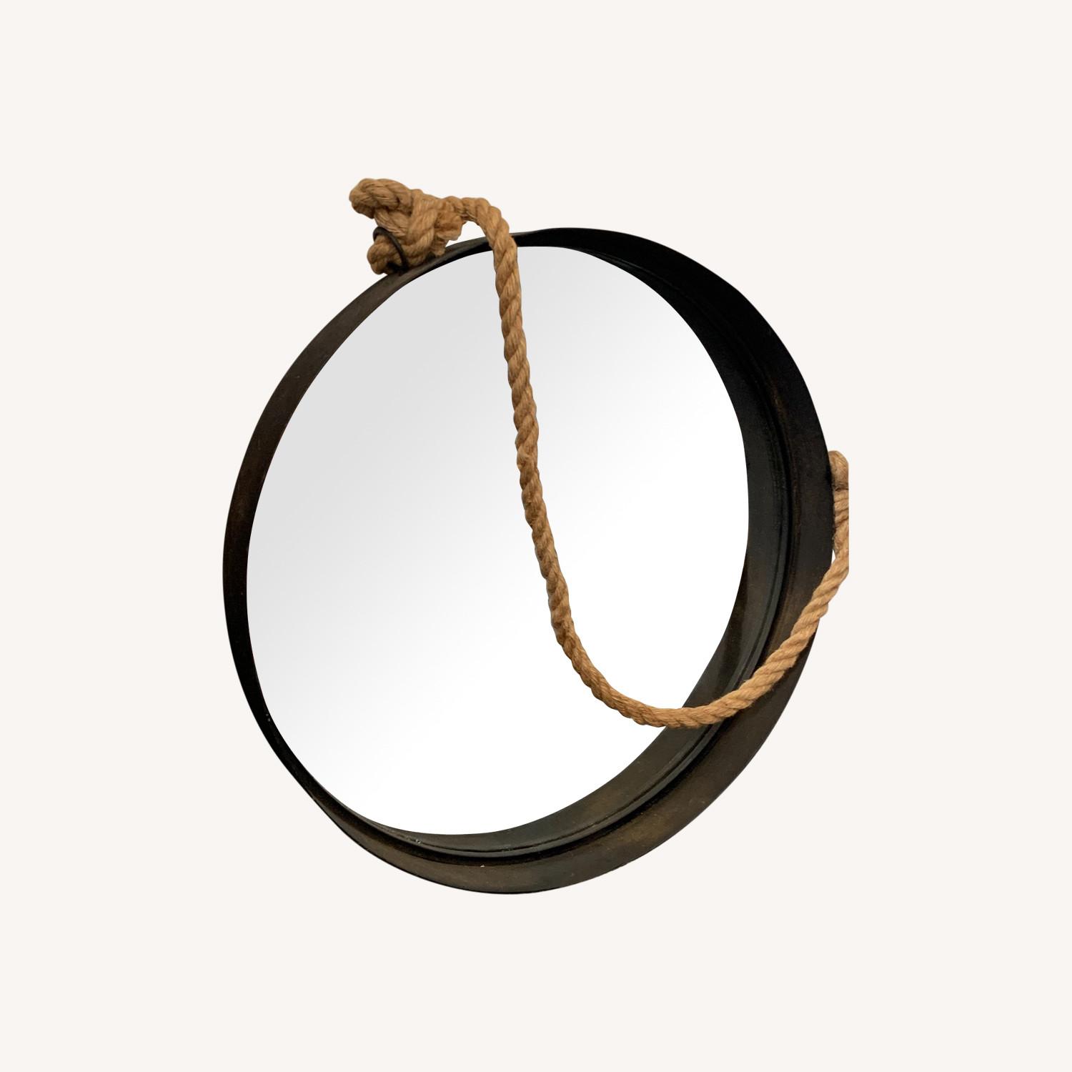Seller's Notes:I found this mirror at a local thrift store and loved it so much I lugged it home. I used it happily in the hallway for about a year. I am now looking to redecorate, so want to find it its new home! I hope you'll love it like I did. The mirror itself is quality, no warping. The outside frame is metal, with what looks to be some discoloration that can be buffed out if you do not like the rustic quality it gives. The rope is a bit frayed, but easily removable. As this is heavy, I recommend its next owner think about securing it well if it will be freestanding.