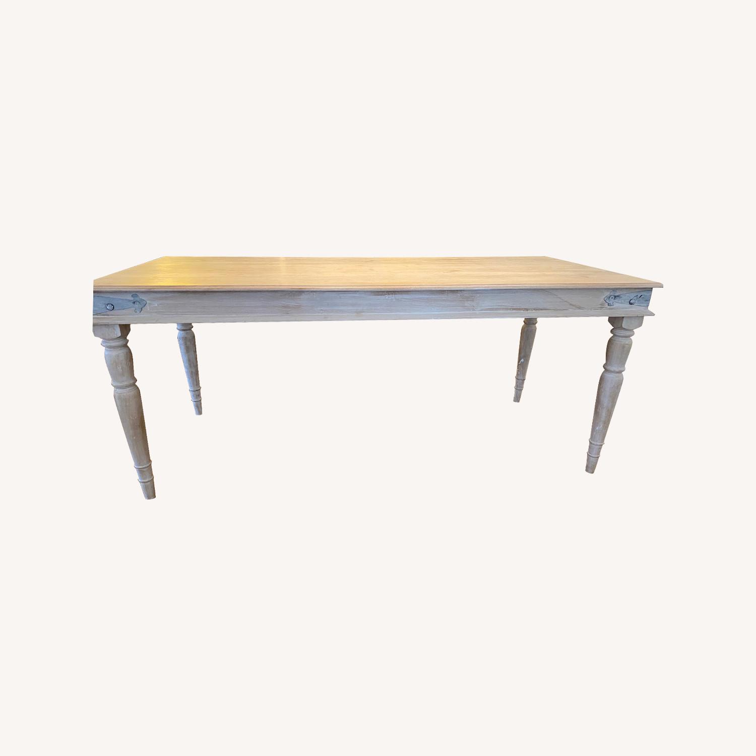 Seller's Notes:Selling our beautiful rustic dining table. We bought it in Europe in May 2018. European style and quality. It’s 100% wood, pickled light natural color. It has really nice metal stubs at the 4 corners. There are a few light stains on the top.