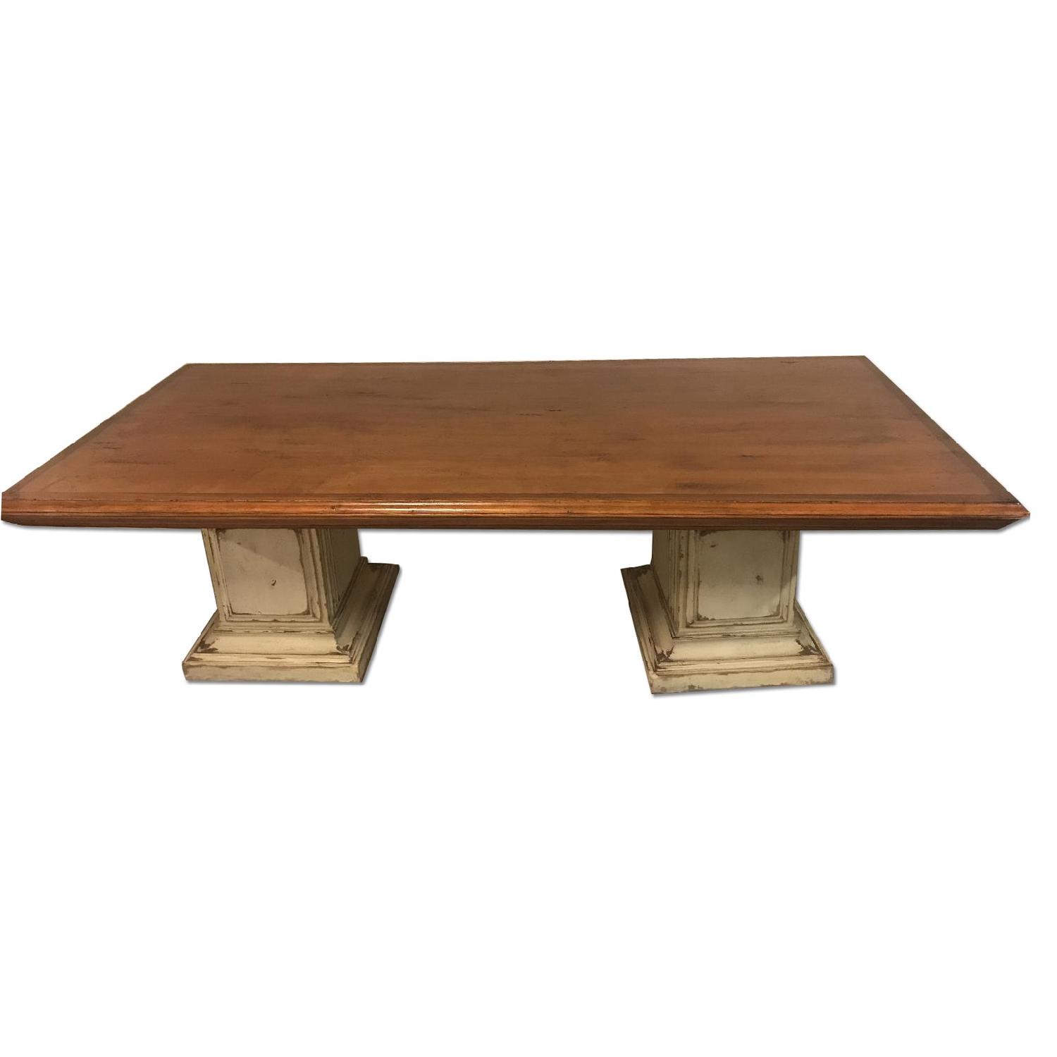 Seller's Notes:This dining table has been out of use for a few years. The top table piece is in very good condition, and placemats were always used. However, one corner of a pedestal does have wear from scratches on one corner (displayed in photos). Please note in the photos that the pedestals are lifted off the ground by plywood in order to prevent any damage in storage.
