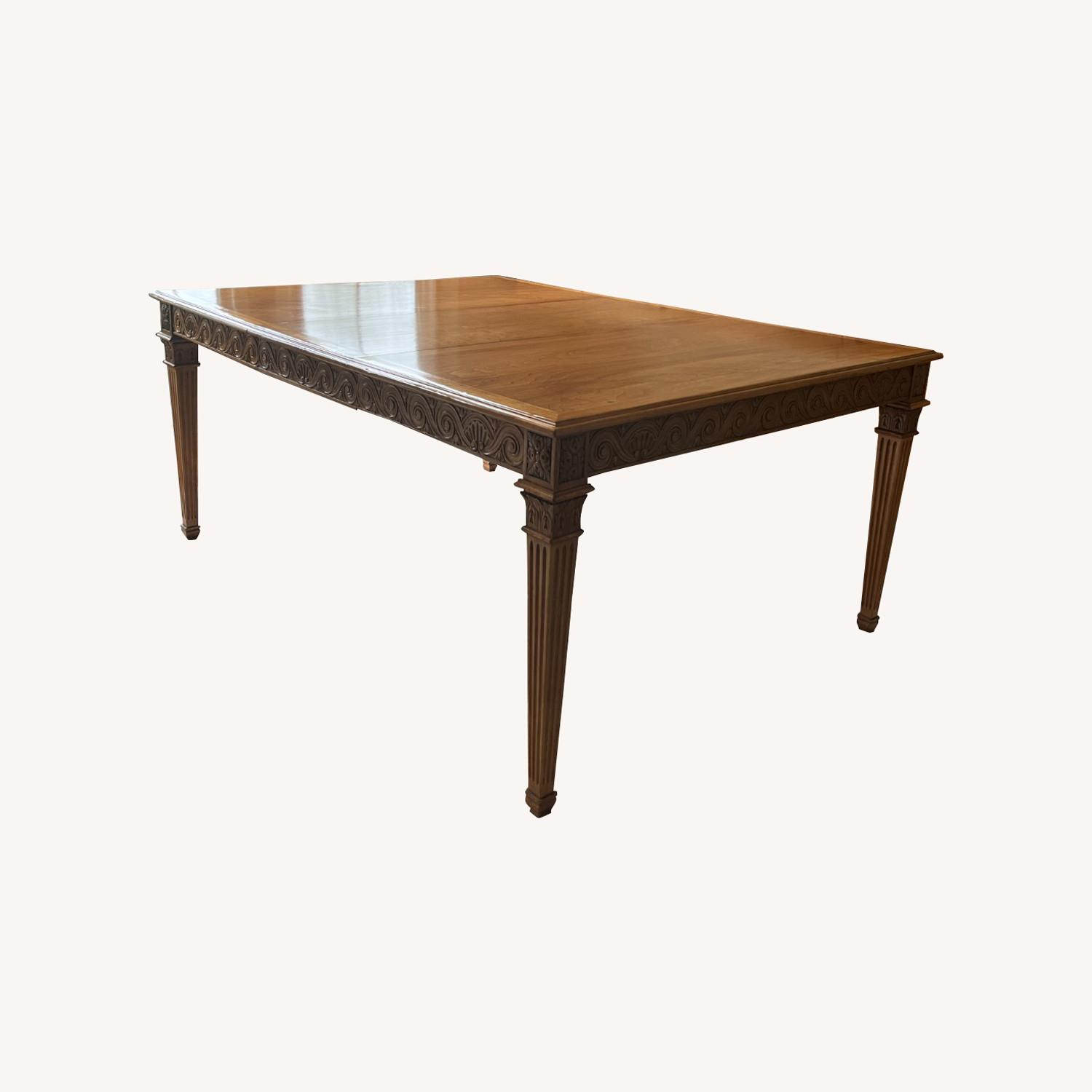 Seller's Notes:*Would prefer to sell before June 8th* This is a custom-designed French Country dining table built in the early 1950s by the now-defunct RWAY/Northern Furniture Co of Sheboygan, Wisconsin. In beautiful condition, this table has weathered almost 75 years of holiday gatherings. The table was professionally polished by an artisan in 1998, and it is still in exceptional condition. It extends with two additional leaves and includes a custom-made table pad, pads and covers for all of the leaves. The table is artfully etched and finished in an elegant golden brown cherry stain. Without leaves, the table is square, measuring 50" by 50". Each leaf adds an additional 17.5"; with 2 leaves, the table is 85" by 50". The height is 29.5".