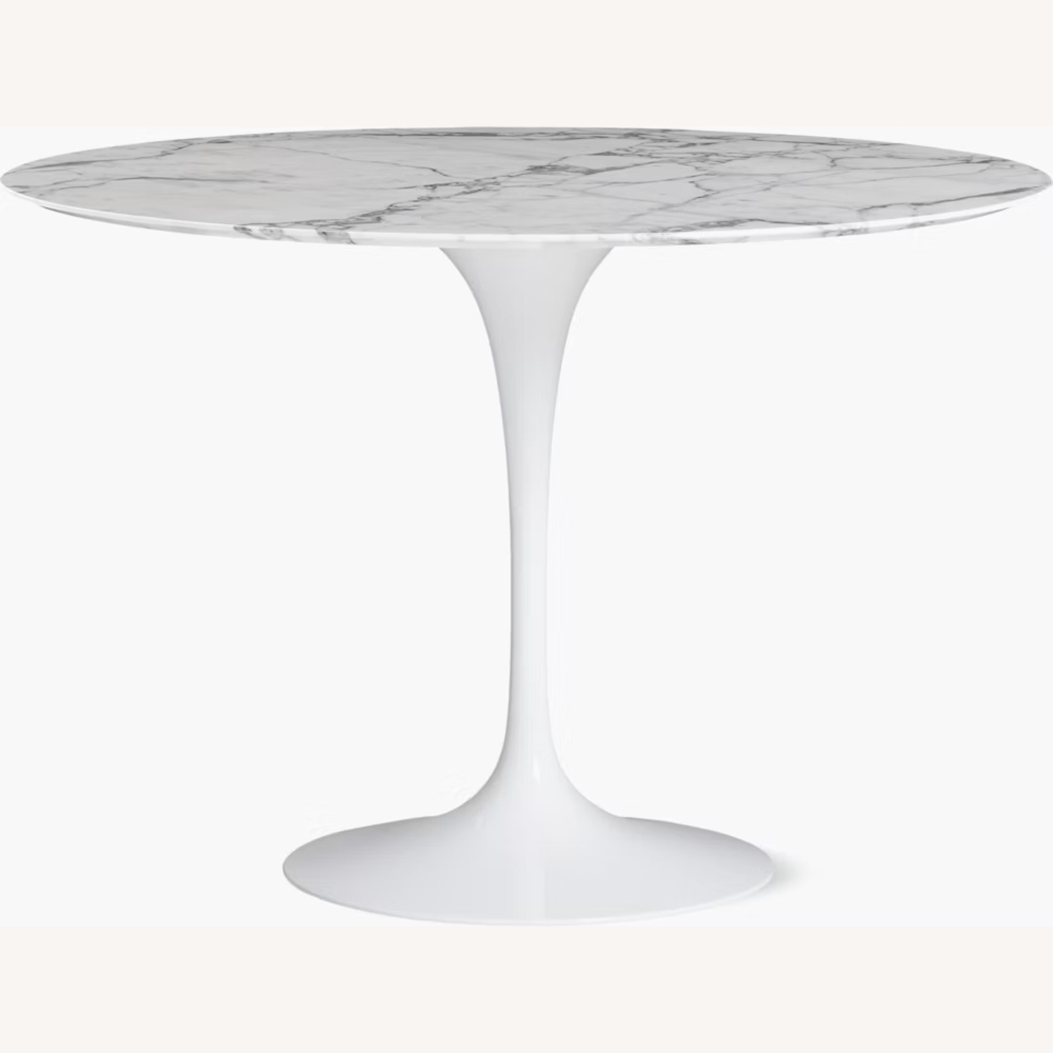 Seller's Notes:Saarinen round dining table, white marble, white base. 42” diameter. In very good condition, purchased directly from Design Within Reach.