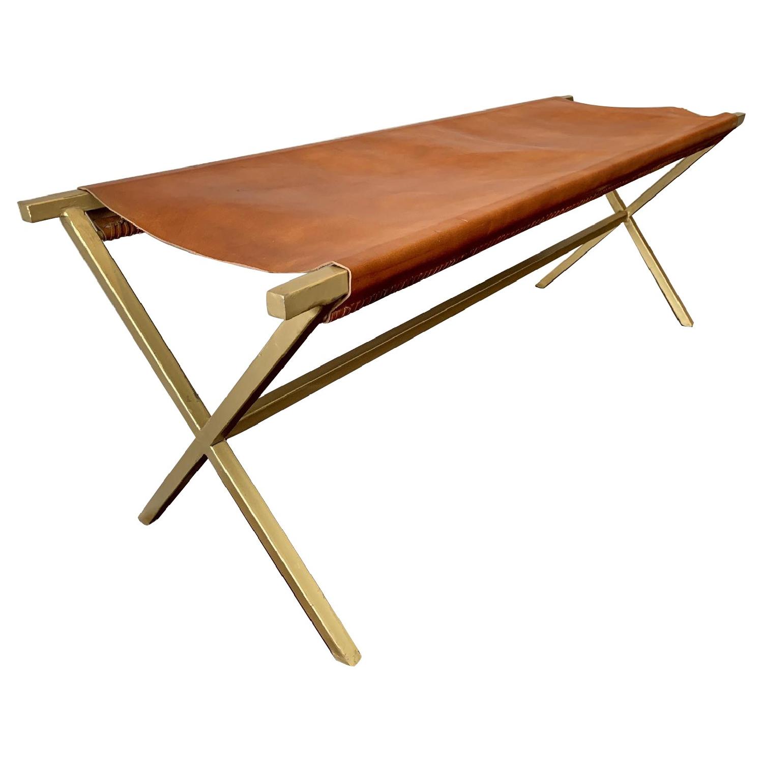Seller's Notes:Leather director's bench in a classic yet modern style. It has a slim iron frame with x-shaped legs that support a seat of whipstitched leather. Perfect for a dining bench, coffee table or position at the end of the bed. It has been very lightly used; I've had it less than 2 months, love it but decided to go with a different color story.