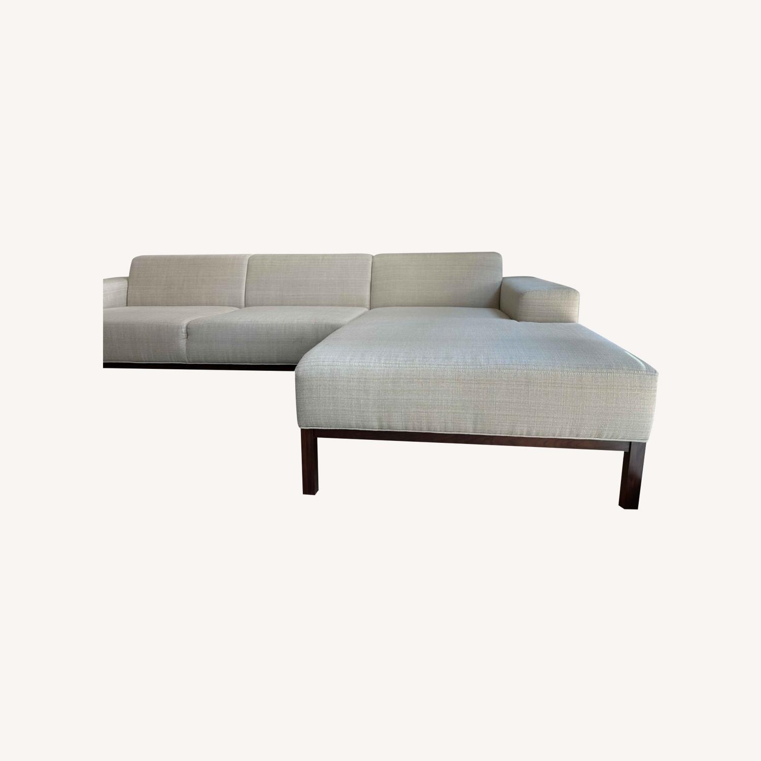 Seller's Notes:Lovely cream sectional that fits very well in an apartment. Purchased April 2021, and now just want a different look. There are some threads pulled in a few spots as pictured, not super noticeable. No stains or blemishes—Took good care of it otherwise. Right-facing 109.45" W x 33.9-61.8" L x 28.35" H