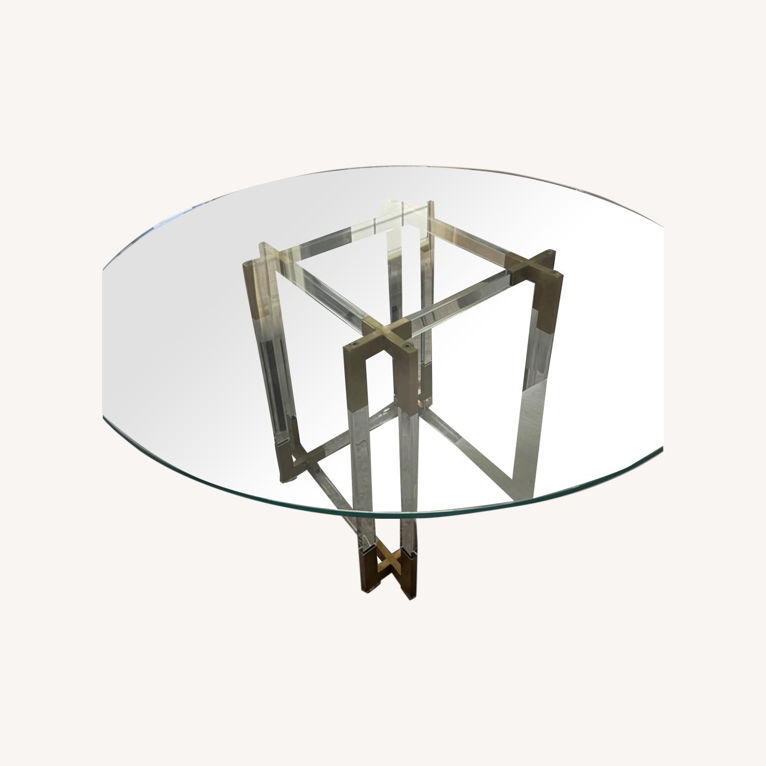 Seller's Notes:Safavieh couture high line dining table. Prestige condition. Glass top. Legs are acrylic with gold touches. Round. Seat 4-6 Purchased from Safavieh in Scarsdale NY