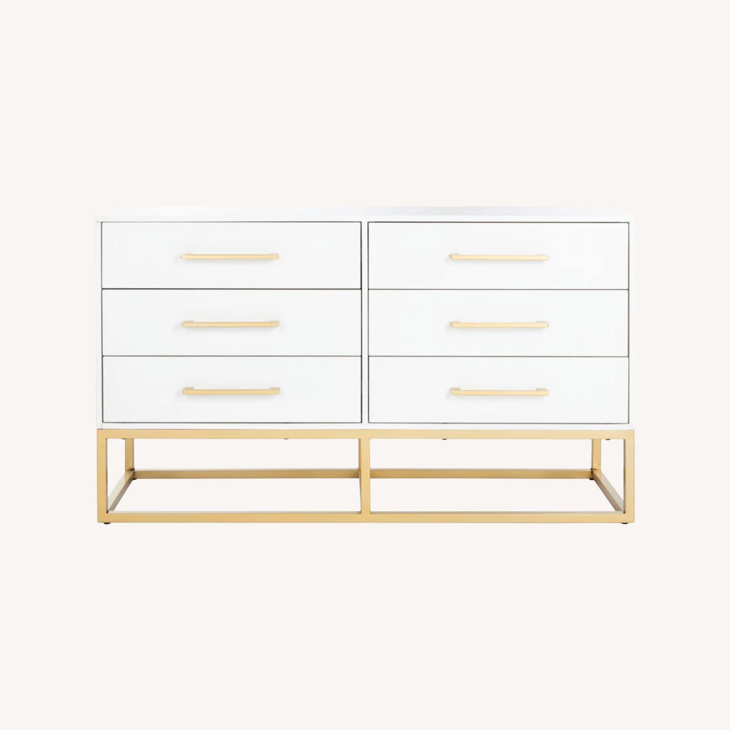 Seller's Notes:Cute, chic dresser in good condition. Has a few small blemishes (shown in photos), but the gold hardware and frame still look great. Spacious drawers plus additional storage space underneath make it both beautiful and functional!