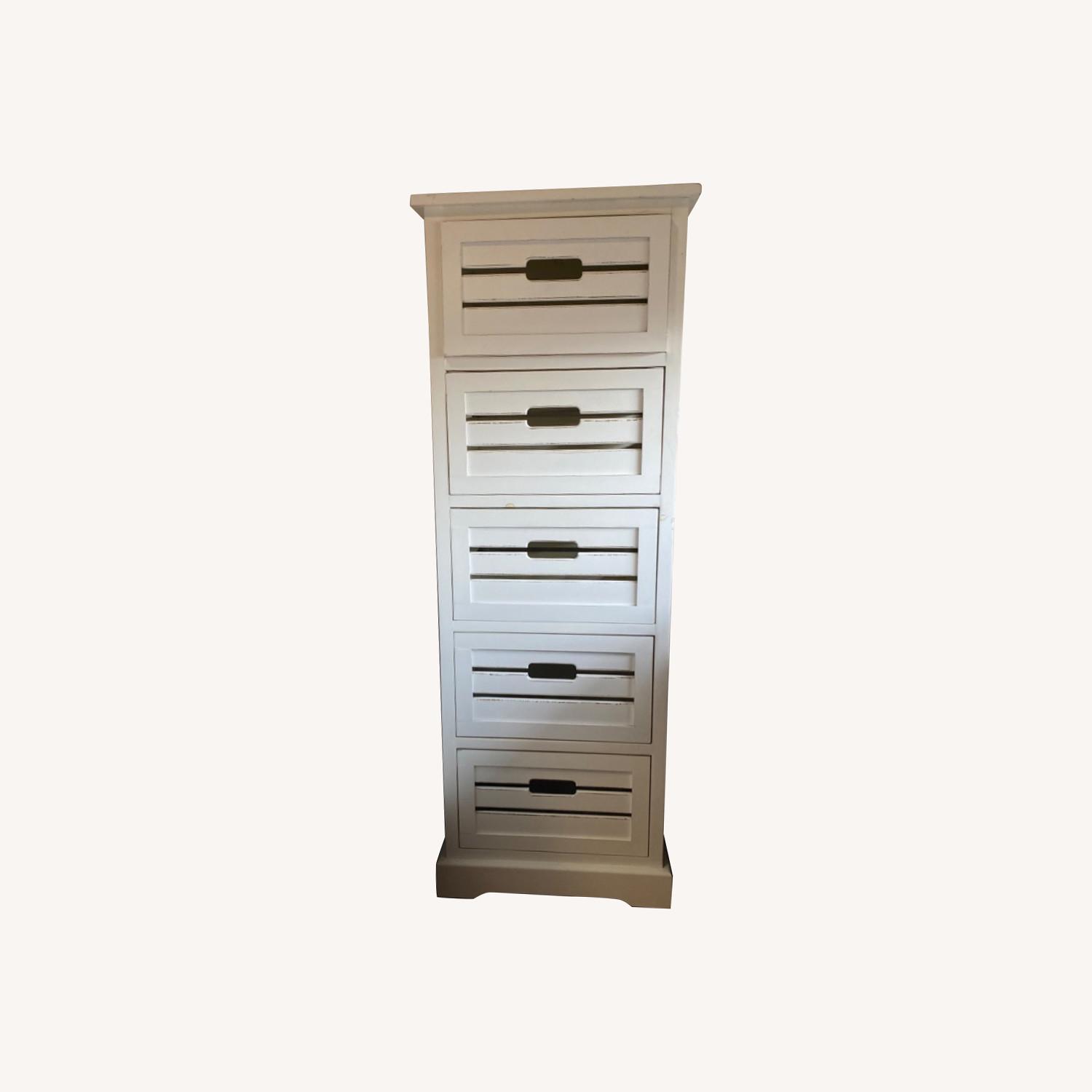 Seller's Notes:Purchased to hold lingerie and small items. Drawers are crate like for a rustic finish. Fit perfectly in my small bedroom. The cream with weathering was a perfect neutral in my decor. Delivered with small discoloration on the third drawer.