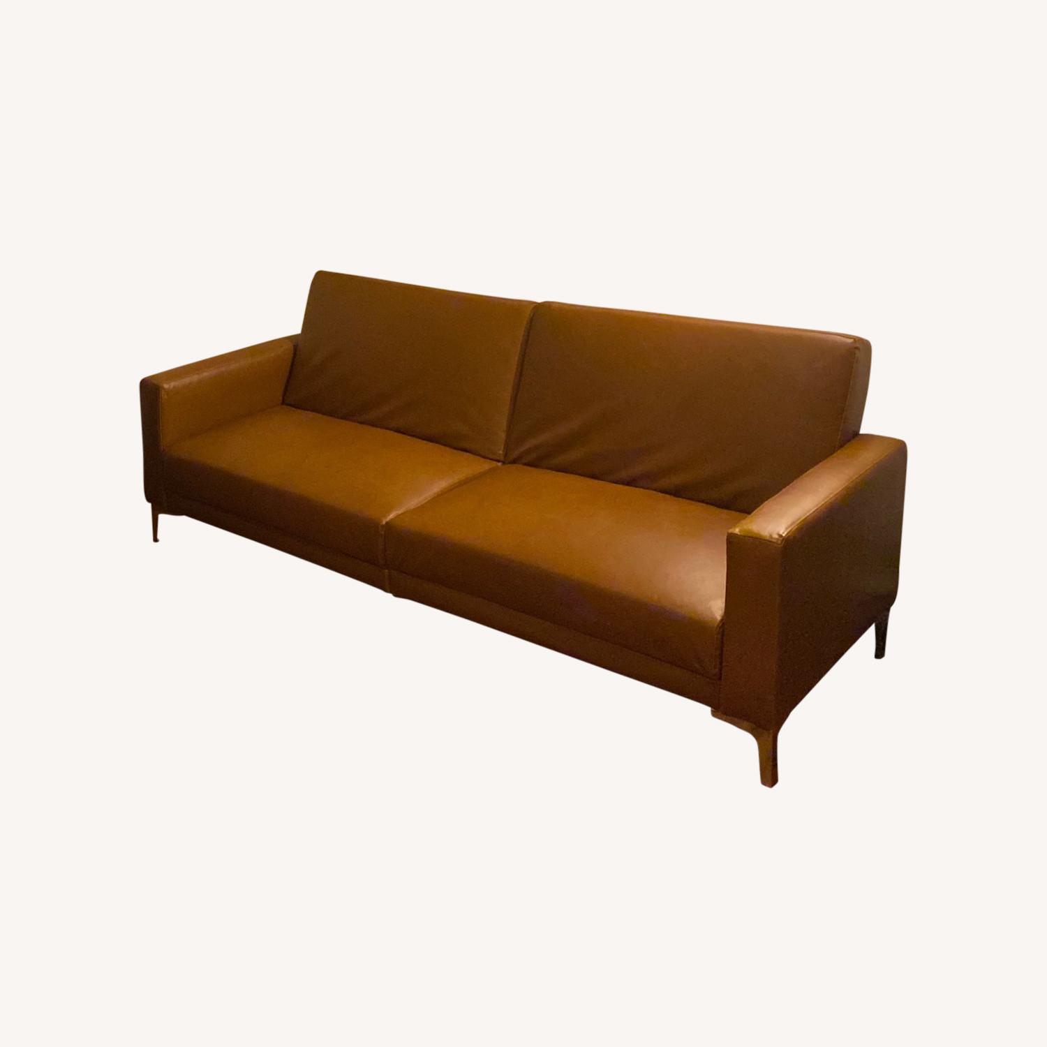 Seller's Notes:Hello! I just moved and purchased a new furniture set, so I want to sell my old couch. It has hardly been used and comes from a non-smoking home with no pets. I rarely ever sat on this couch because I had a big bean bag chair that I used more. It is in pristine condition. I actually bought it initially to match the aesthetic of the home but almost never used it. -- cognac color leather with chrome feet -- measures 32.7 inches high x 79.1 inches wide x 33.1 inches deep -- also folds out like a futon -- originally purchased from overstock.com The couch is currently wrapped up in blankets and plastic and is ready to pick up. I also have a furniture dolly and can help bring it to your vehicle should you choose to pick it up on your own instead of having it delivered. Happy to answer any additional questions that may come up! Thanks!