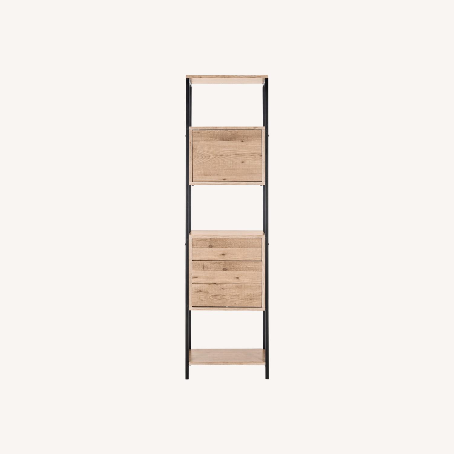 Features a natural oak finish with a sleek black metal frame in a slim, mid-century silhouette. Three open shelves provide beautiful display space for books, décor, or plants, with additional concealed drawer storage below.