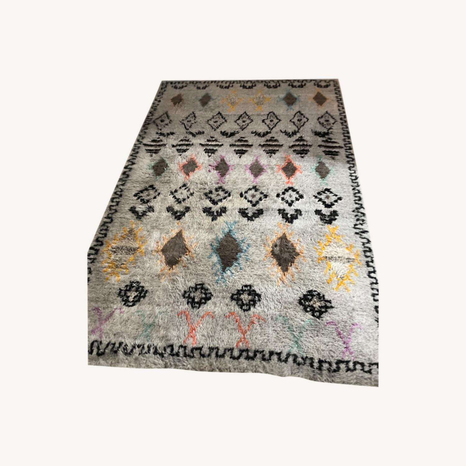 Seller's Notes:Safavieh 5 x 8 area rug. All wool. Brown,grey, black- pink, orange, turquoise tribal pattern. Thick and a bit shaggy. Used in office, little traffic. Moving must sell. 6 x9 also available.