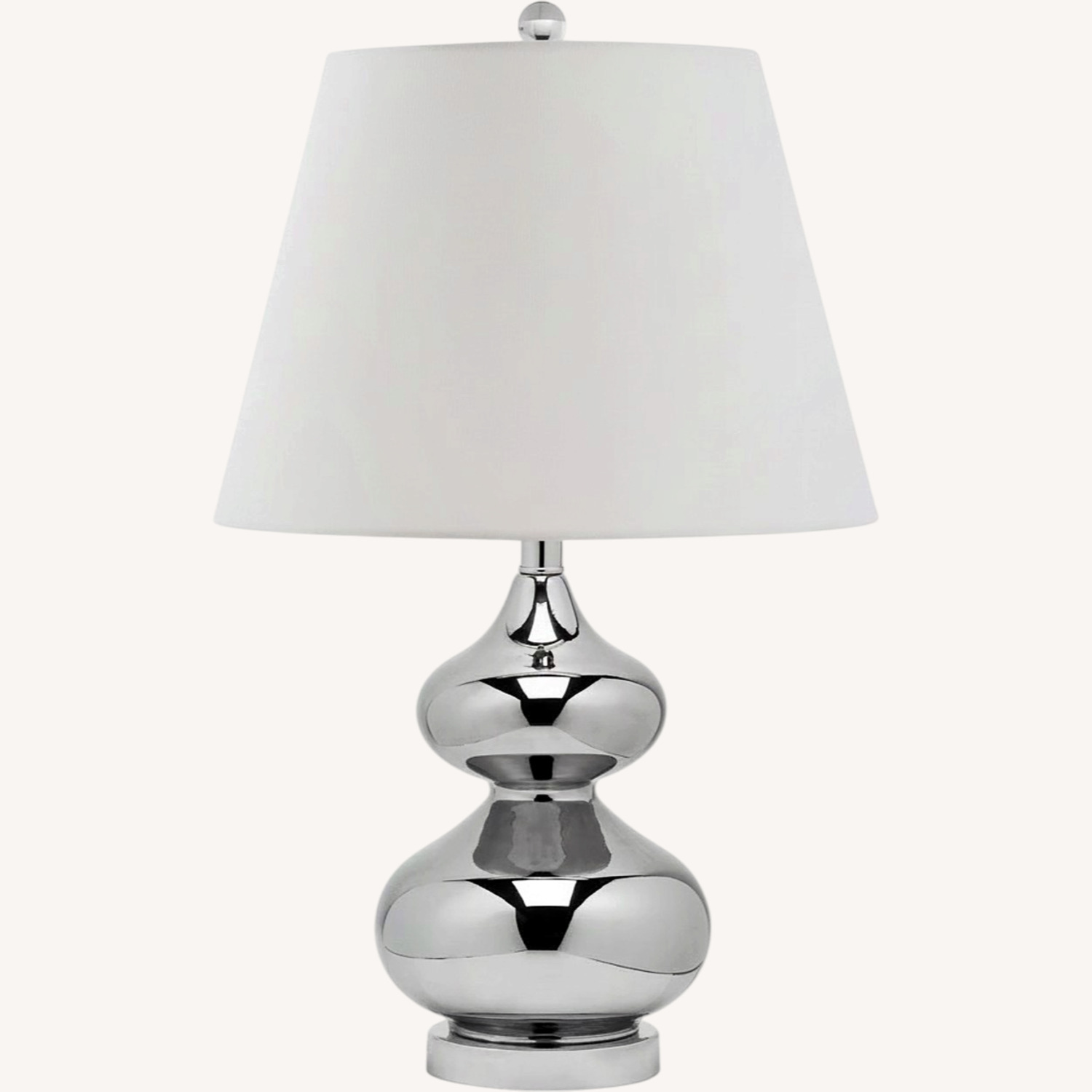 Elegant Design: This SAFAVIEH Eva Double Gourd Glass Table Lamp features a sophisticated silver finish, complemented by a matching finial and a brushed silver metal base and neck, adding a fresh look to any room.