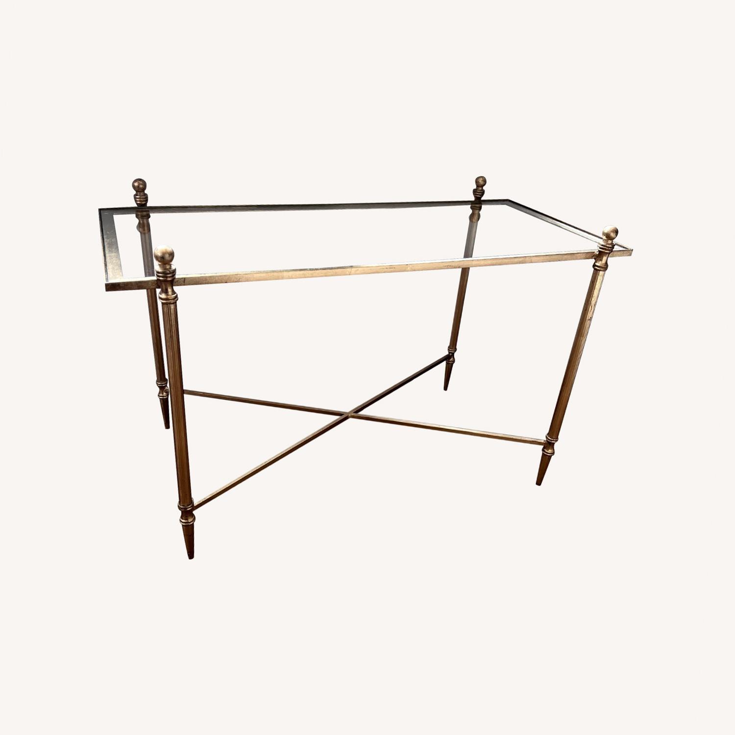 Seller's Notes:A few minor scratches on glass but barely noticeable; can remove glass top to clean underneath and inside edges of metal framing. Beautiful antique gold color; elegant looking; can be used as a small coffee table or side table.