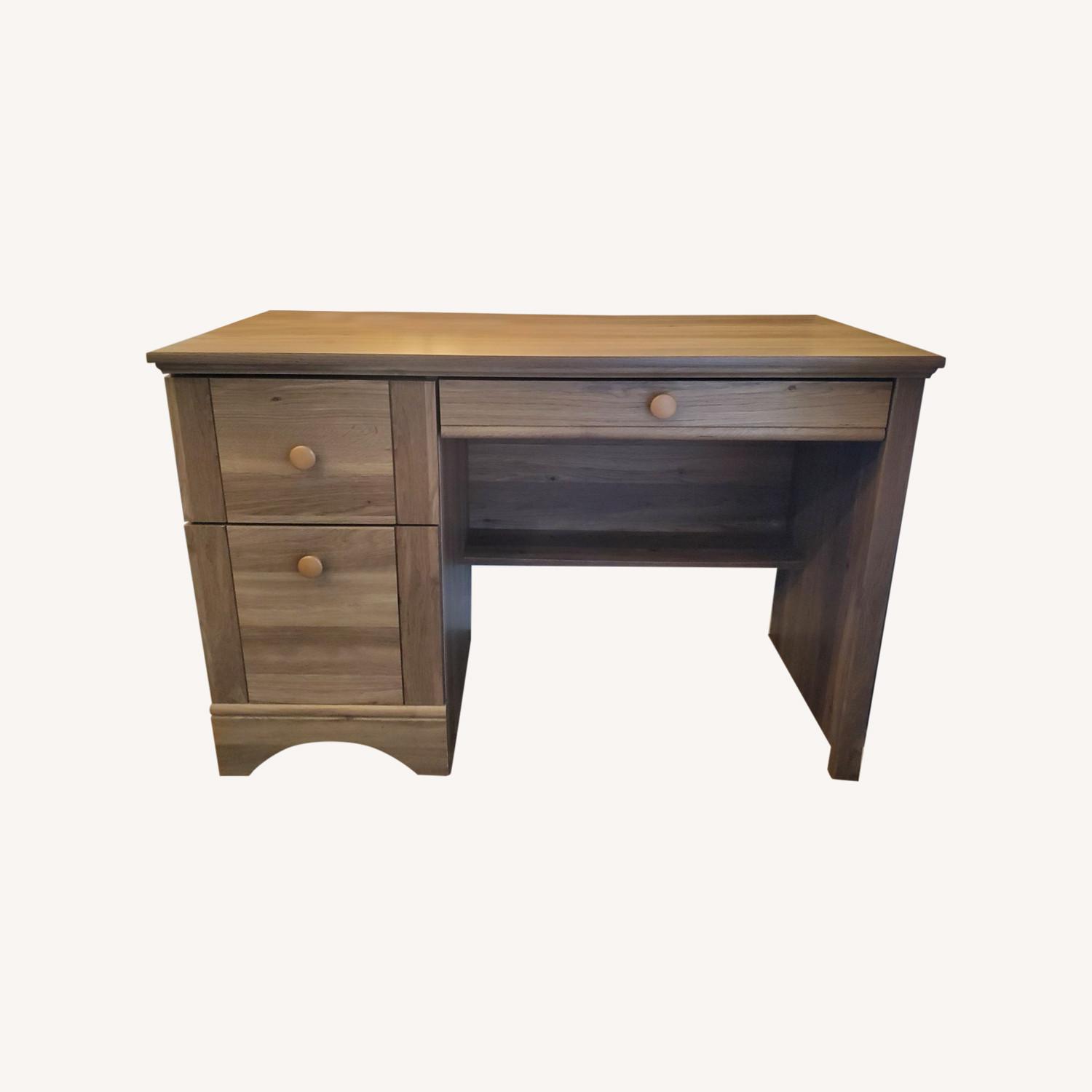 Seller's Notes:Salt Oak Finish. Purchased in January 2022. A computer desk featuring an easy-gliding drawershelf, a flip-down panel for your keyboard, two storage drawers and a book shelf. Very elegant and in great condition!