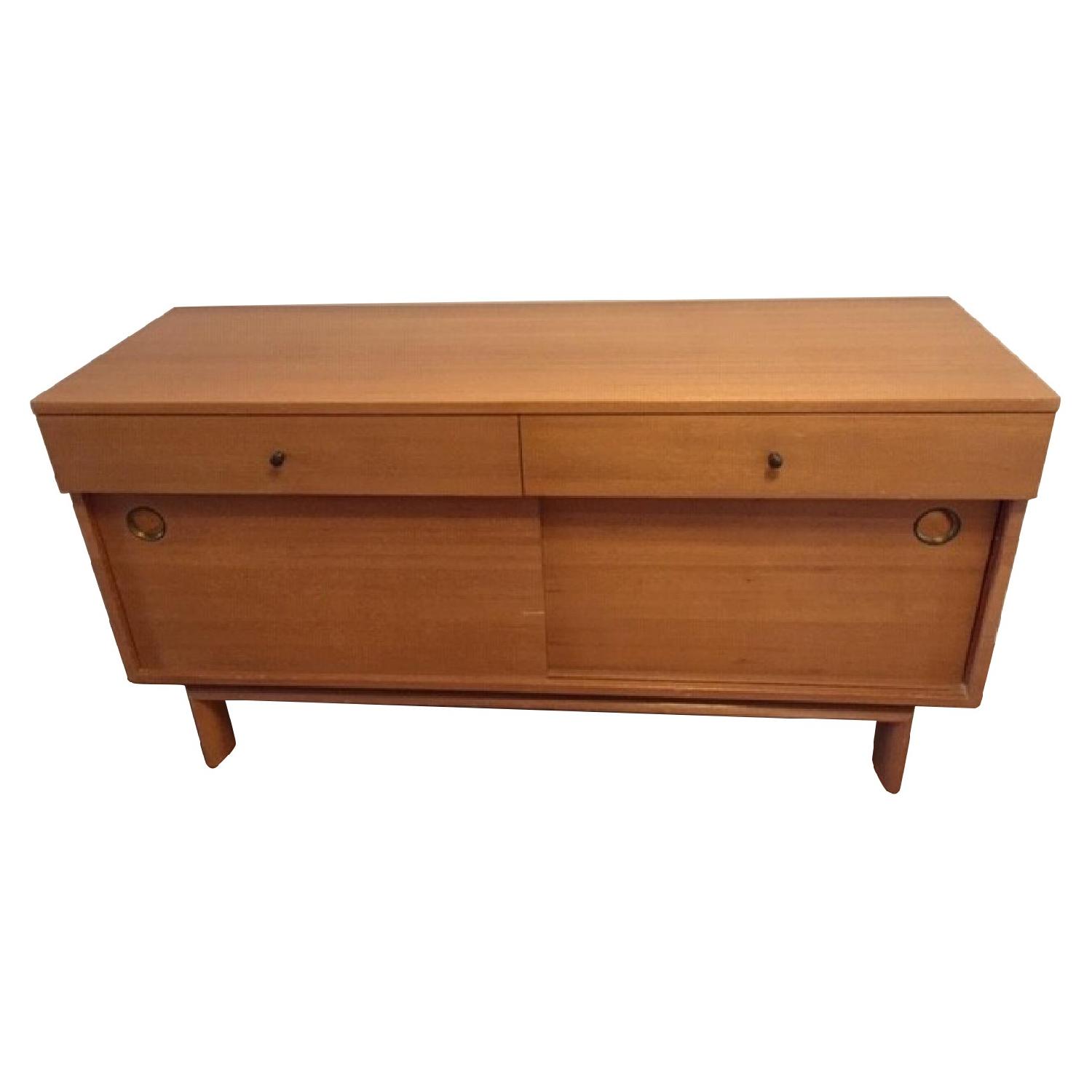 Seller's Notes:This is a classic mid-century modern credenza/sideboard/buffet made by iconic California furniture maker Brown-Saltman in the 1950’s. Brown-Saltman was famous for extraordinarily well-made and designed furniture, with an exceptional eye for detail. This exceptional piece features 2 drawers (2 ½” high x 15”deep) and excellent storage underneath hidden by two sliding doors. (The 2 cabinet interiors on each side are 15” deep and 16” high.) The finish is original and is in excellent vintage condition. Gently used and in very good condition (with minor wear and few tiny scratches). The original Brown Saltman label is present inside the right drawer.