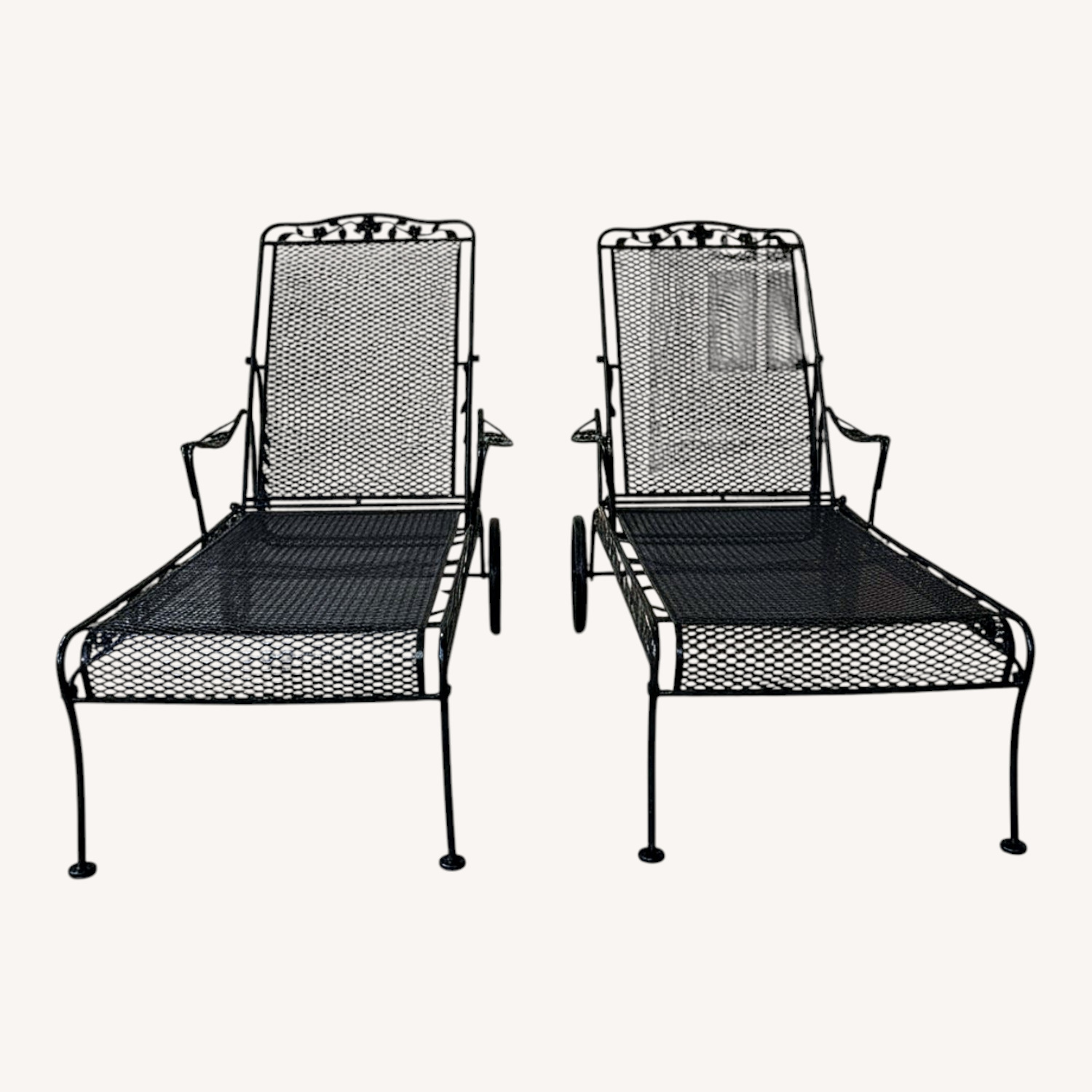 Seller's Notes:A refined pair of vintage wrought iron chaise loungers by the Sam Blount Company. These pieces feature a sculpted floral motif along the crest rail and sides, paired with a classic expanded metal mesh deck. The lines are balanced and deliberate—ornamental without excess. Each chaise offers an adjustable reclining back and integrated rear wheels for easy movement. The iron frame is substantial and stable, with a weight and presence consistent with American-made patio furniture of the period. The finish presents cleanly in a deep gloss black, giving the pair a crisp, reflective surface that highlights the floral appliqué and mesh pattern. Well-suited for a stone terrace, covered porch, or poolside setting. The profile is low and elongated, with a visual lightness from the open mesh contrasted by the solidity of the frame. Original Sam Blount Co. branding sticker located beneath one foot of one chair. Serial number: 486186 Dimensions Weight: 54 Lbs Back Rest Height: 44.5 Inches Seat Height: 15.5 inches Seat Width: 21 inches Fully extended length: 76 inches Folded length: 61 inches Arm Width: 31 Inches Arm Height: 23 Tire Width: 27 inches