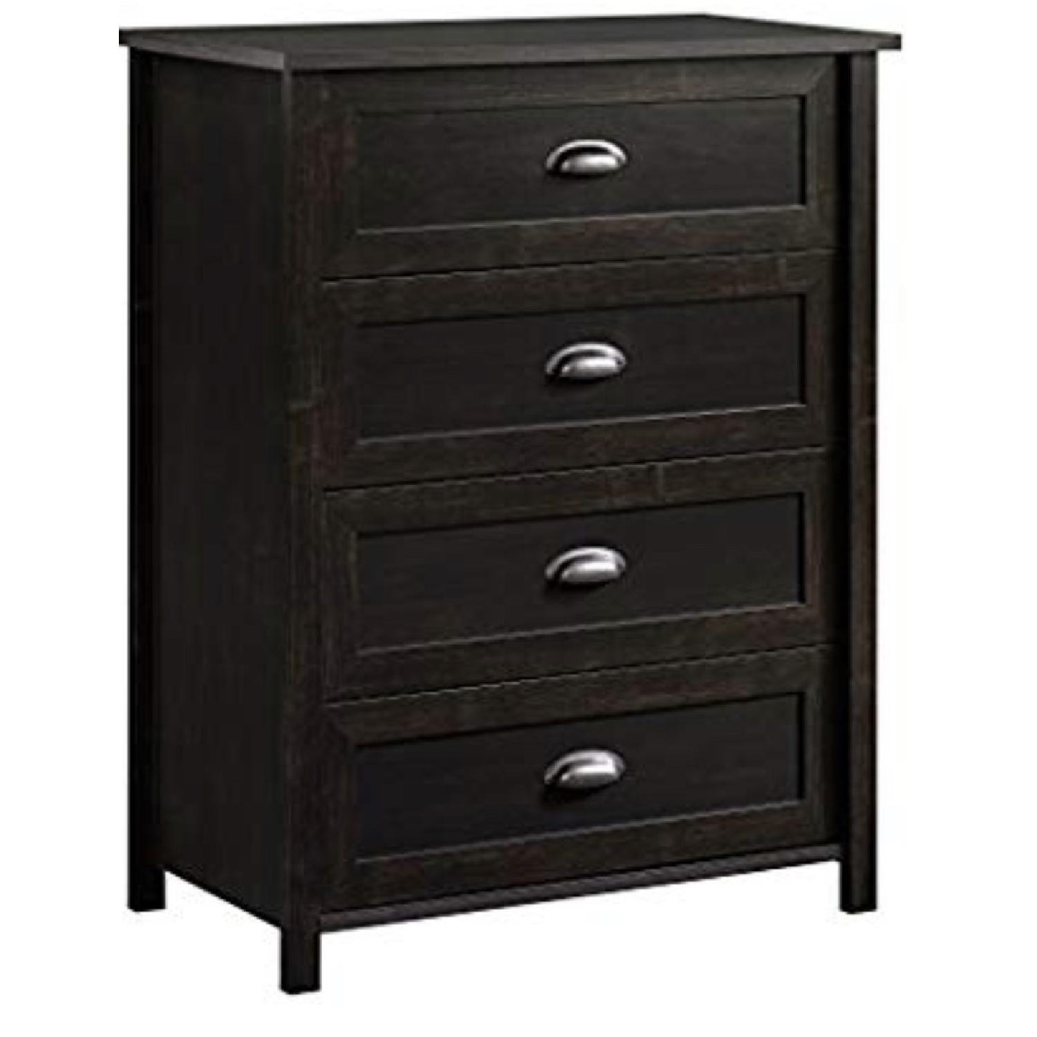 Seller's Notes:Sauder county line 4 drawer chest/dresser. 2 years old, excellent condition, appears brand new. Features four large drawers that open and close on smooth metal runners, Spacious drawers are ideal. Roomy top surface also makes a great space to display home décor items and sore other bedroom essentials. Engineered black wood, with estate black finish, detailed with frame panel drawer fronts and stylish hardware 32.2"L x 18.35"W x 41.4"H
