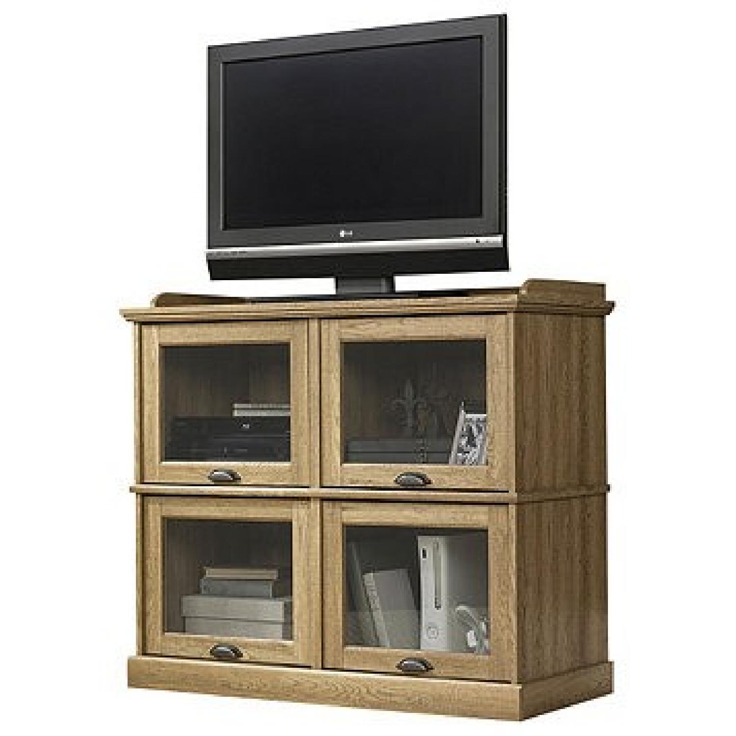 Seller's Notes:Sauder Barrister Lane Highboy TV Stand • Dimensions: 41.63W x 18.75D x 36.9H in. • High-quality engineered wood with laminate • Salt Oak finish • Fits TV up to 45 inches • Features 4 compartments for enclosed storage