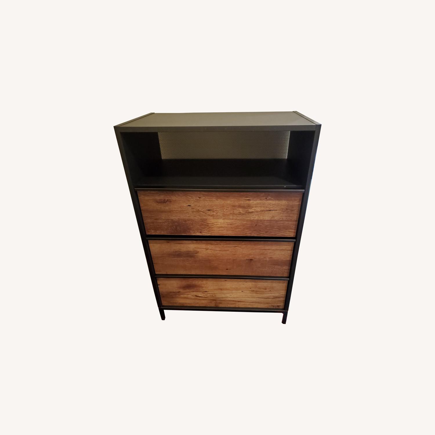 Seller's Notes:I purchased this at Target last fall and didn't actually assemble it until March of this year. I have been using it, it's great for clothing and has some nice mesh detailing. It also has metal feet. I am moving and need to downsize the amount of funiture I'm bringing with me - and this dresser is great but doesn't match my other furniture. It has a light scratch mark on the side, you can't really feel it, but it came with the mark on it when I opened the box. The bottom drawer has trouble sliding open; it needs to be pulled over the lip of the metal frame on the bottom but opens to the full extension.