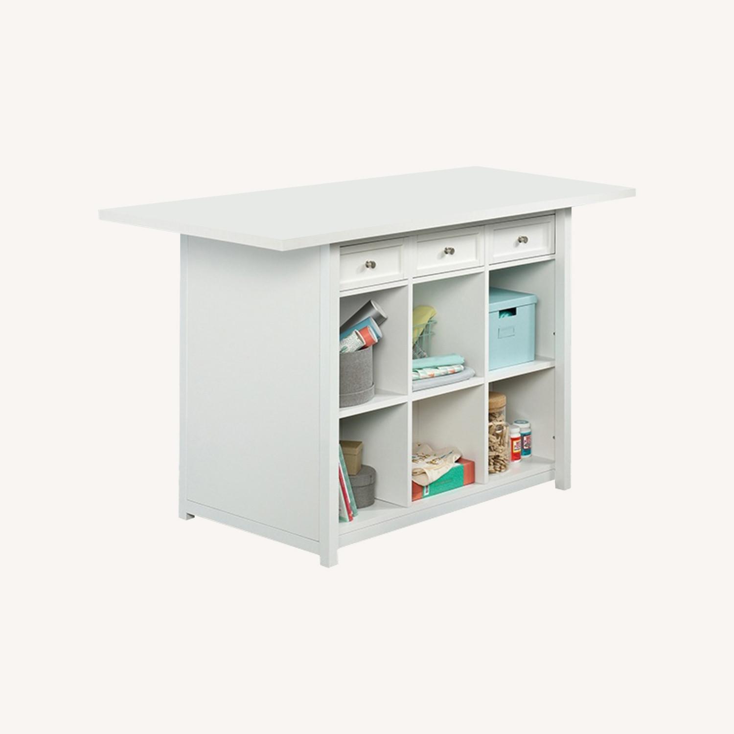 Seller's Notes:Purchased a year ago when we moved into our house as a quick fix, but it doesn't fit the space now that we are settling in. Has minor scuffs and wear, but still in great condition! Description from Sauder: Looking for an all-in-one work space where you can let your creativity and imagination run wild? Well we’ve got just the piece for you! This work table from the Craft Pro Series® collection is everything you need and more. Its spacious work surface provides you with ample room for sewing, scrapbooking, and knitting, plus space for all your supplies too. The large top surface of this craft work table is melamine, which is resistant to heat, stains and scratches so you can craft all day with no worries. It features three spacious storage drawers that are ideal for stowing away supplies like stickers, scissors, tape and much more. For flexible placement, these drawers can be pulled out from either side of the table to create easy access to supplies no matter where you stand. The drawers are also removable and can function as a supply tray. This handy craft work table also includes six open-shelf cubby holes for convenient storage of bins and jars of supplies, books, fabric and scrapbook paper too. Finished on all sides in White, this versatile craft work table will make all your crafting dreams come true. Whether your aesthetic changes with the seasons or centers on a vibe that you share with family and friends through handmade gifts, this crafting table is where it all begins. Now let’s get crafting!