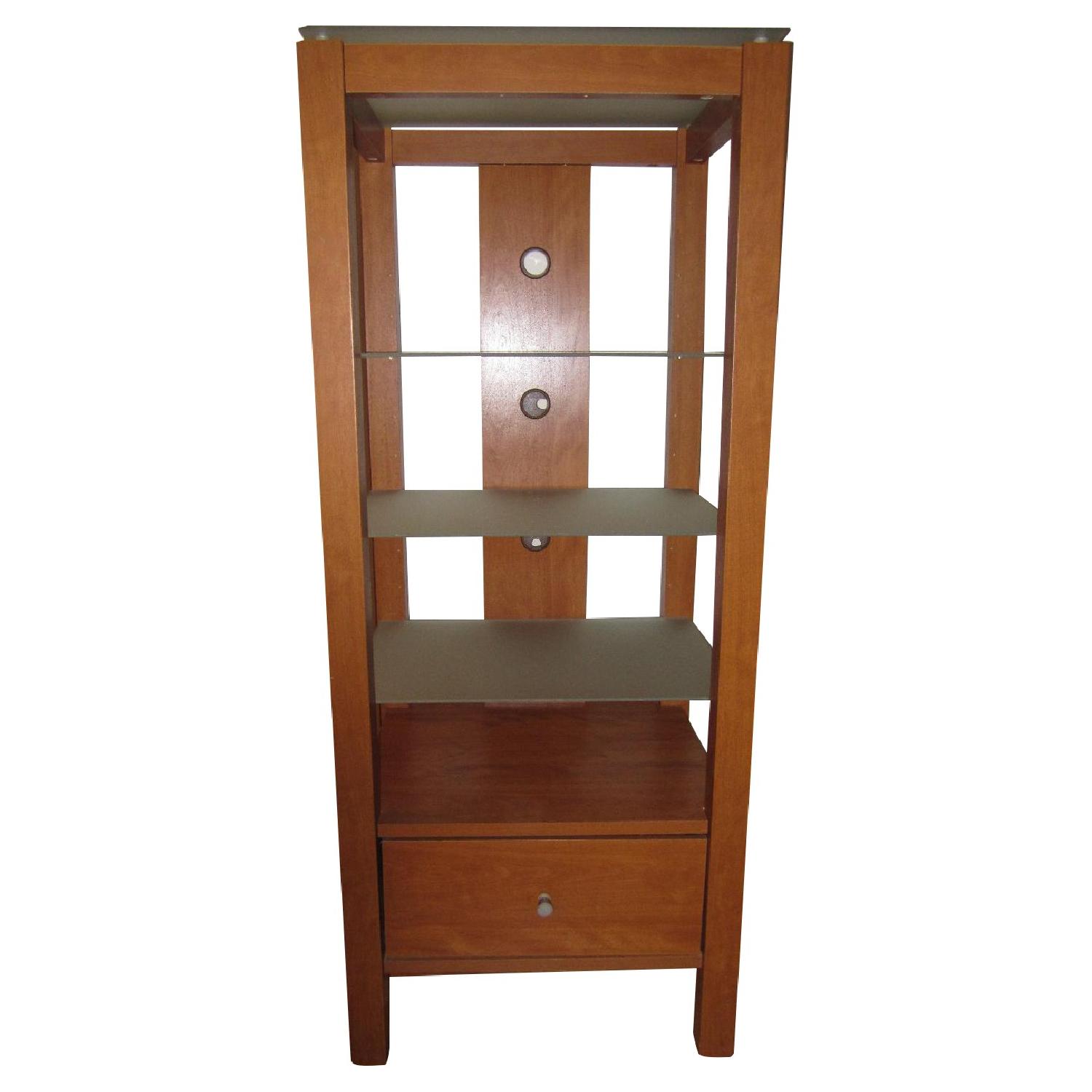 Seller's Notes:Set of two SAUDER shelves. Both are light brown wood veneer and have 3 adjustable/removable opaque glass shelves, a non-removable top one and a drawer at the bottom. The back of each contains cable entrances. Only one of the shelves has small indentations (exactly as shown in the pictures).