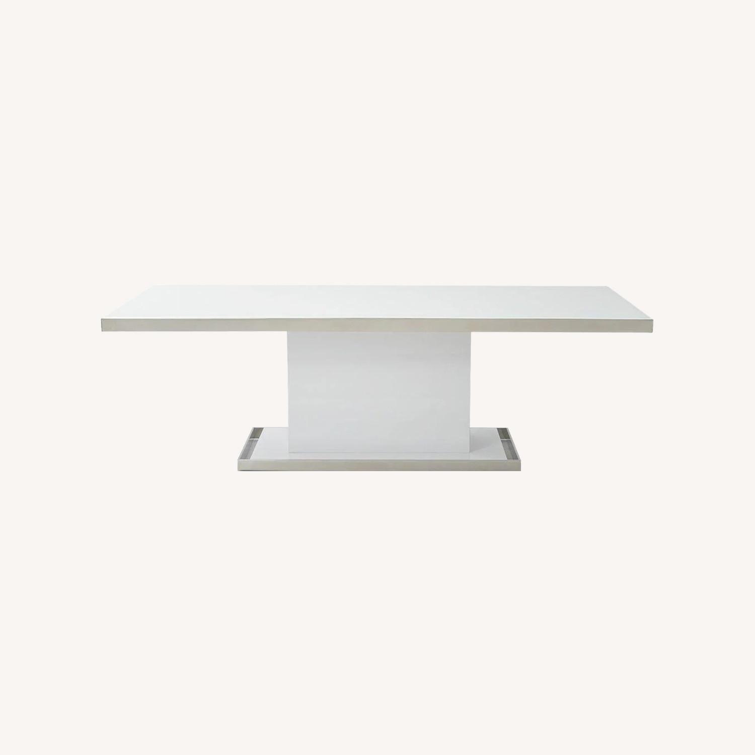 Establish a sleek and bold contemporary aesthetic in your dining room with the Svante 94” Dining Table. Comfortably serve eight as you gather around this distinctive piece featuring clean lines and a pedestal base trimmed in stainless steel.