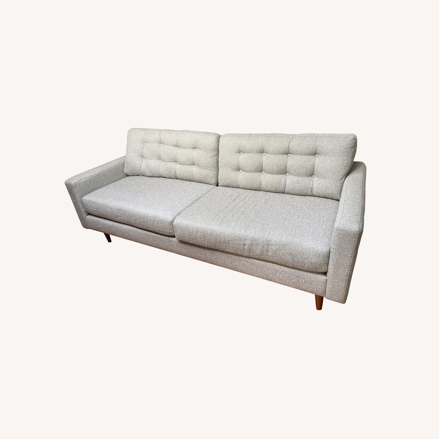 Seller's Notes:Sofa only used for 3 years. Beautiful in any space. Long sofa which allows for multiple people to comfortably sit. Sad to see it go, but looking forward to giving it a second life with someone else! ABOUT THE EVERLY SOFA Bring a mid-century modern aesthetic into your living room with the USA-made Everly Sofa. We love the exquisite design lines and tufted upholstery, while the walnut finish of the tapered legs provides a subtle, organic flourish. Given that the upholstery has a neutral, textured look, you can feel confident styling the space around this sofa any way you please.