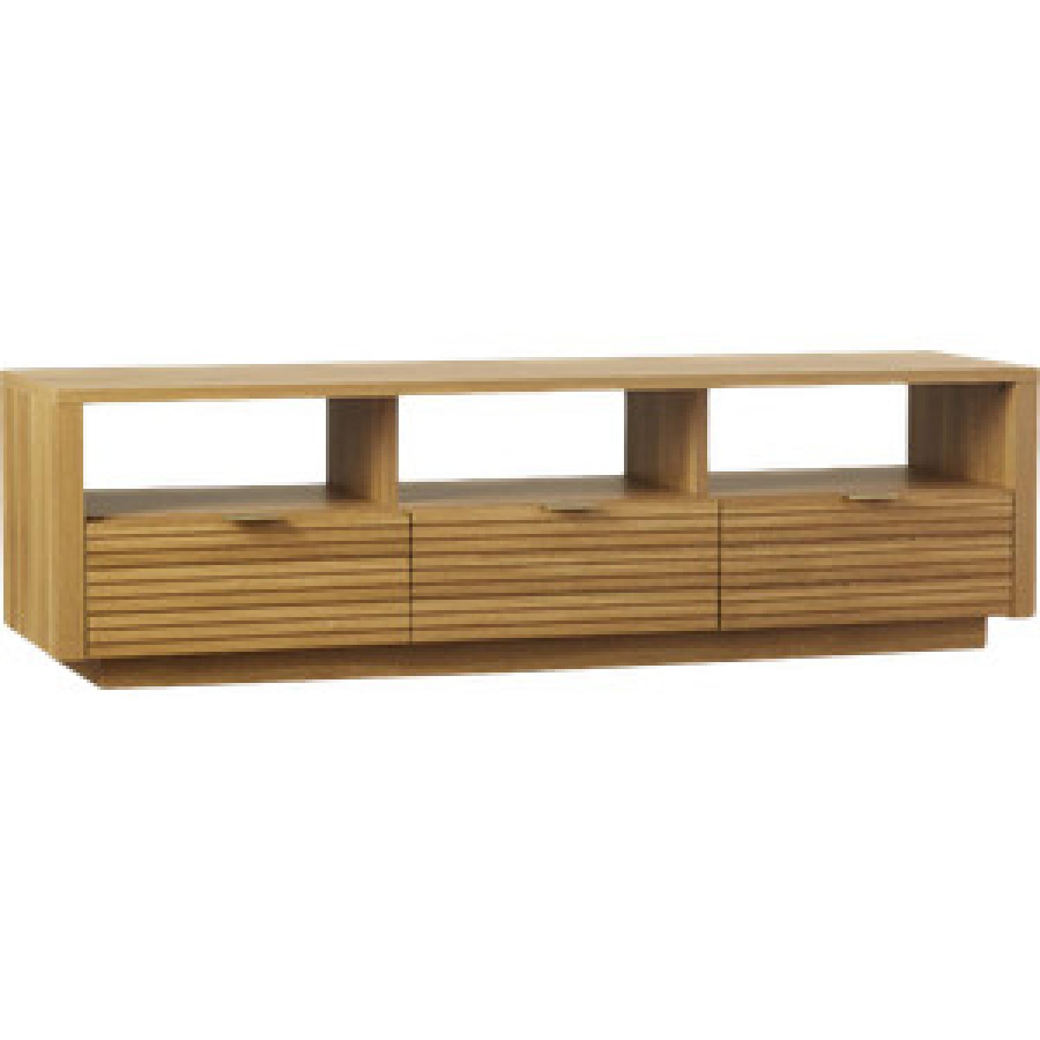Seller's Notes:Right side is loose/broken but can be fixed. Scandinavian style TV Stand. Oak finishing. 158 lbs. Three drawers and three open shelves that give you ample space for storage and display. The drawers have enough storage space for your books or other necessary items. The drawers have a line design with metal glides for easy functionality of opening and closing. The metallic handles of the drawers give you a firm grip to open and close the drawers easily. Made in USA.