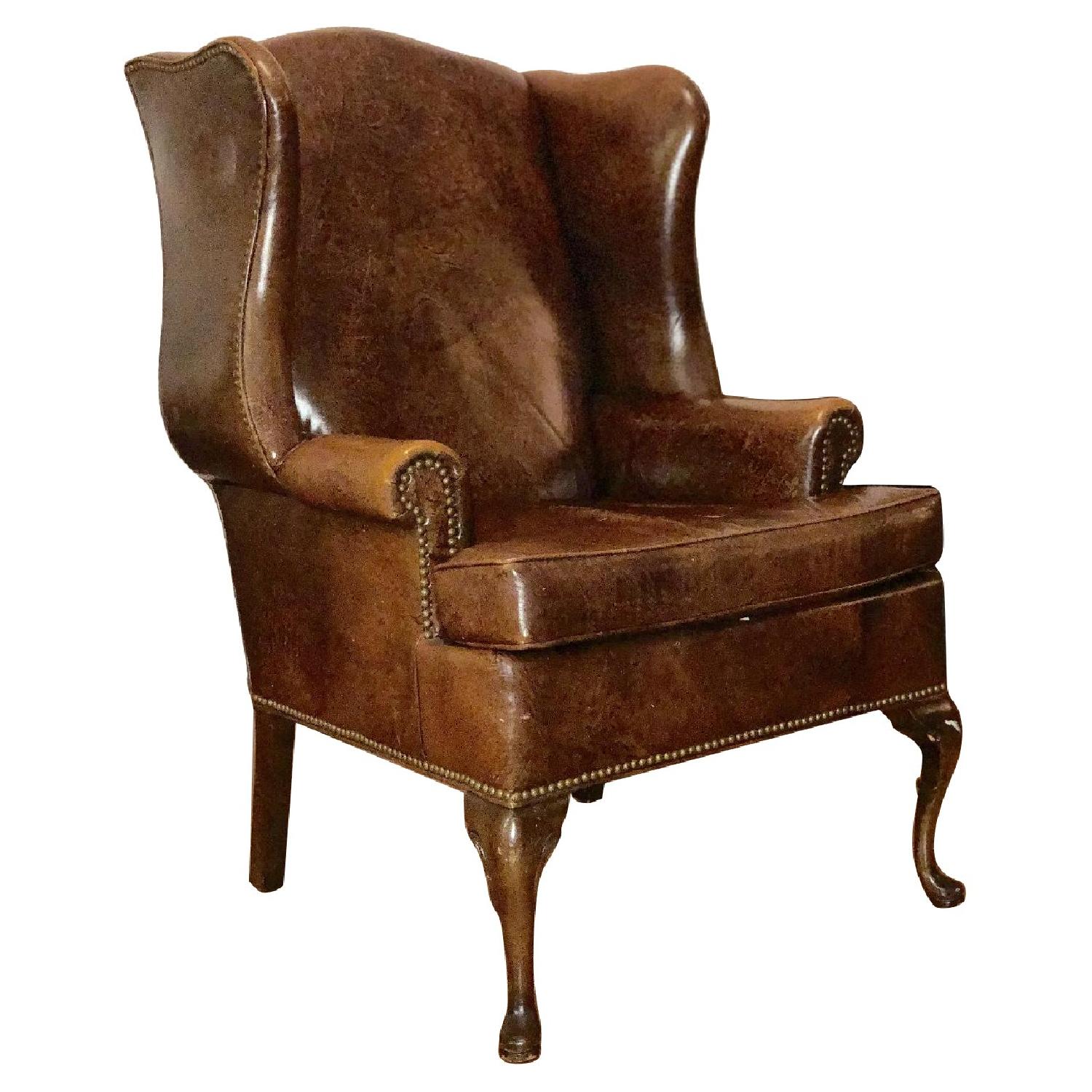 Seller's Notes:Classic brown leather wing back chair with brass nailhead detail. I bought this chair used, a year ago. I’m not sure how old it actually is. Has some tears on seat and white scuff mark on left side of wing back and front leg.