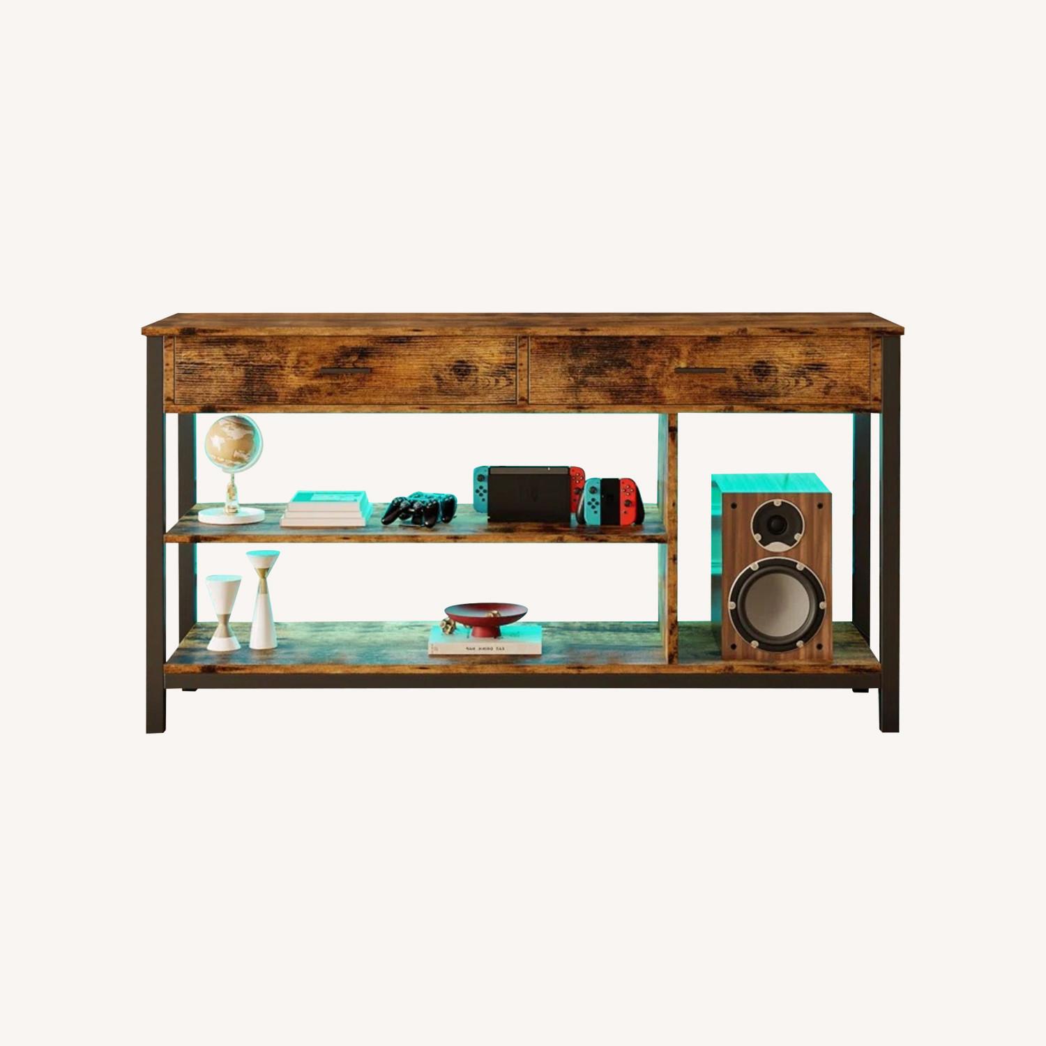 Seller's Notes:TV stand made for up to 55 inch TV and has working power outlet. Good for having TV that is 30 inches above the ground. Drawer on right side may be a little stuck but can still be opened. Also comes with optional LED strip + remote.