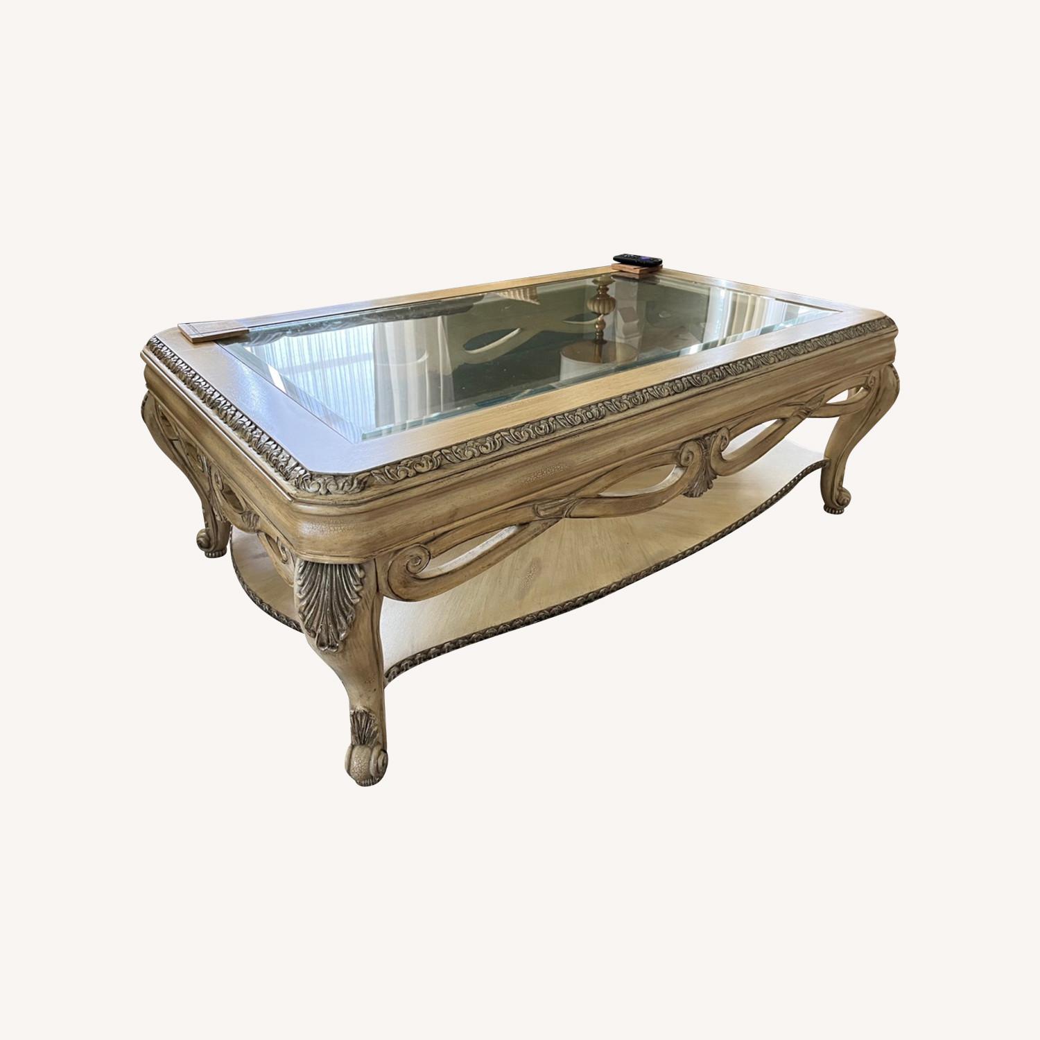 Schnadig Carved Wood Coffee Table W Beveled Glass