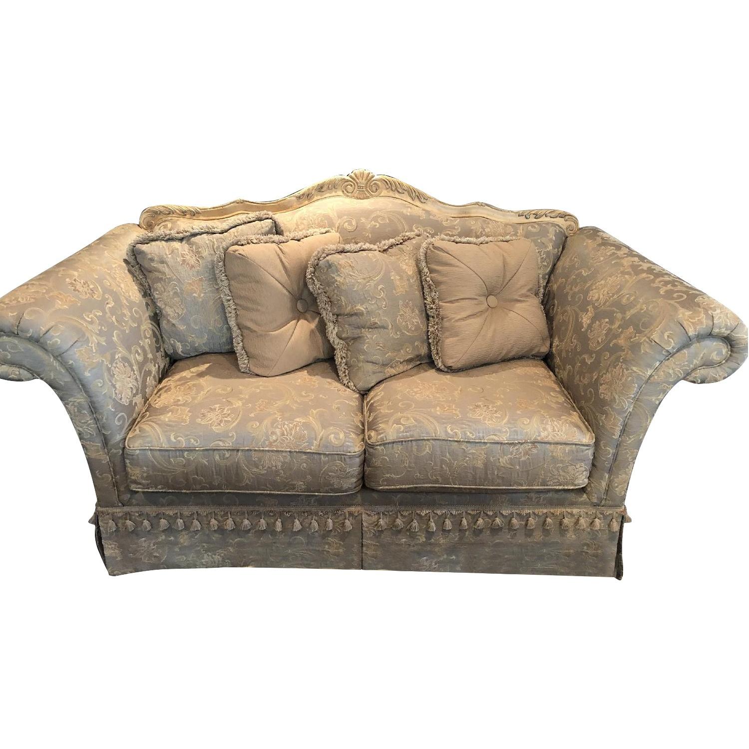 Seller's Notes:Beautiful Schnadig living room set. The color is a type of blue/gray with a goldfish pattern. The set has a couch, love seat, chaise, coffee table and (2) side tables9all listed separately on the site). All in terrific shape. The couch is the largest piece of the set. The set also has 10 plush matching pillows. Table have a glass top. Very pretty designs and also very comfortable. Selling the furniture so we can redesign the room.