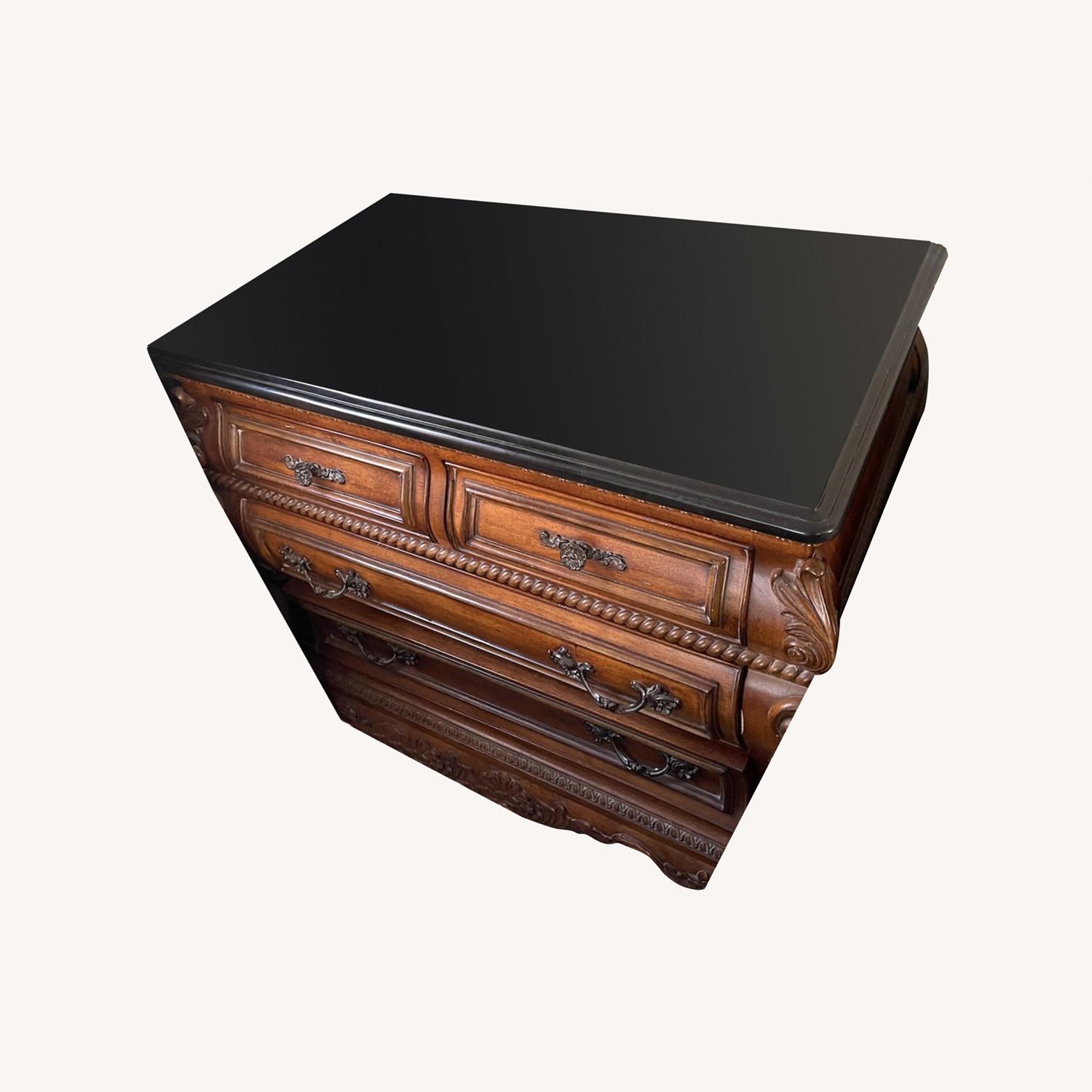 Seller's Notes:Dark brown vintage dresser with black marble top minimal wear & tear 2 big drawers, 2 smaller drawers beautiful accents and handles