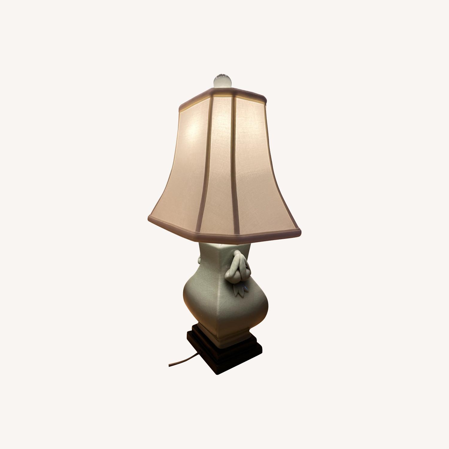 Seller's Notes:From Scully & Scully comes this elegant handmade celadon green porcelain table with matching hand painted porcelain finial and unique amphora-style pomegranate handle detailing. The lamp comes with a lined and piped off-white shade. The lamp accommodates a three-way bulb up to 150 watts, which is included. The on-off switch is on the socket. At the base of the shade, the compact lamp measures 12" in width x 9" in depth, and the entire lamp measures 23" to the top of the matching hand painted porcelain finial. The base of the lamp itself measures 5.25" in width and 4.25" in depth, and, at its widest point, the body of the lamp is 6 inches wide and 5 inches in depth. This beautiful lamp has been well taken care of. It is in perfect working order and in flawless condition.