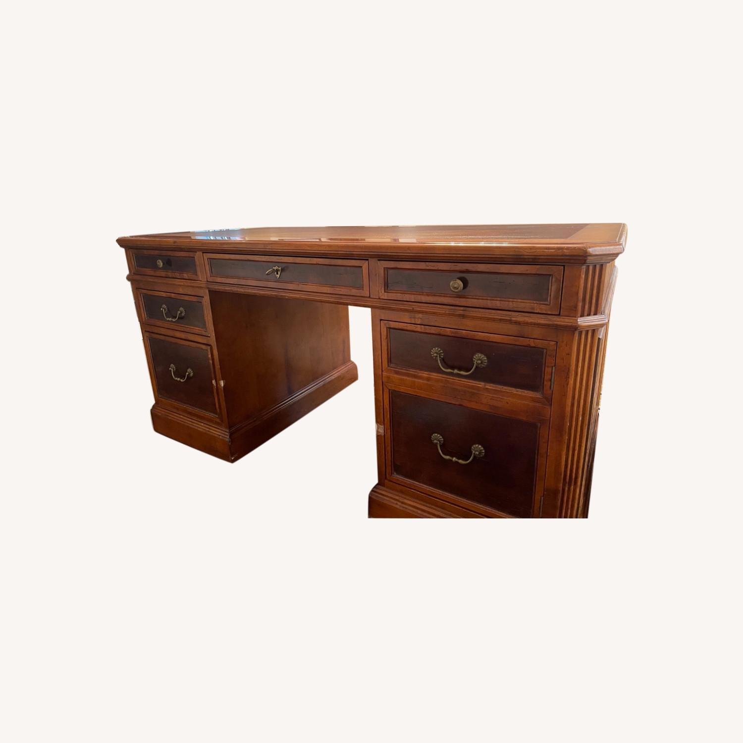 Seller's Notes:Beautiful Scully & Scully desk, purchased in 2003. The bottom left drawer is a filing drawer and what appears to be 2 drawers on the bottom right actually open as a cabinet. This desk has been loved for almost 20 years and has moderate wear and tear. The two biggest blemishes are scratches on the front of the desk, which can be seen in the photographs. Some of the drawers have loose handles.