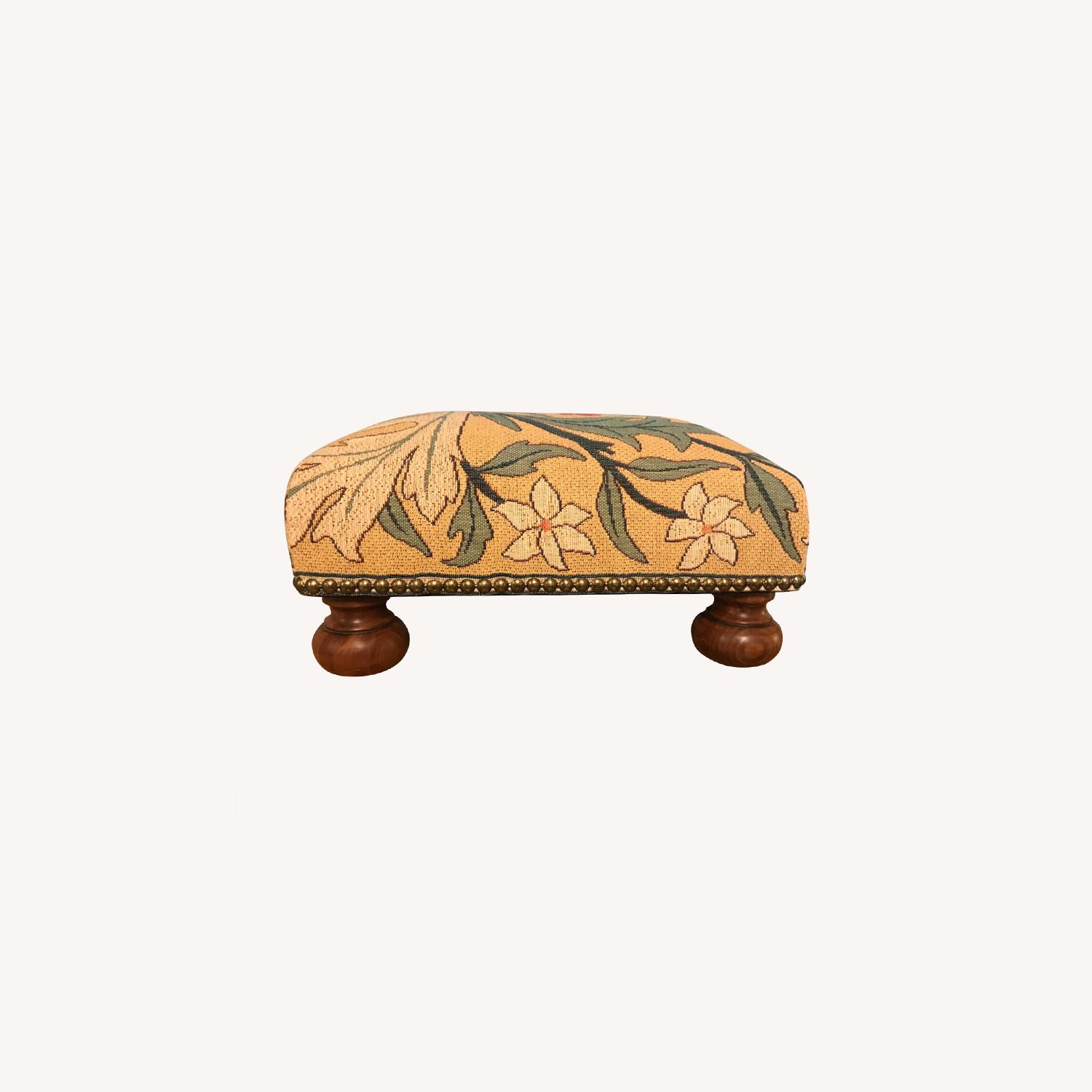 Seller's Notes:Solid beech Bunn feet and traditional style brass tack studding distinguish this beautiful footstool. Top of footstool is made in cotton blend jacquard tapestry woven in Belgium and finished in England. Design is based on a William Morris study. Sold exclusively by Scully & Scully.