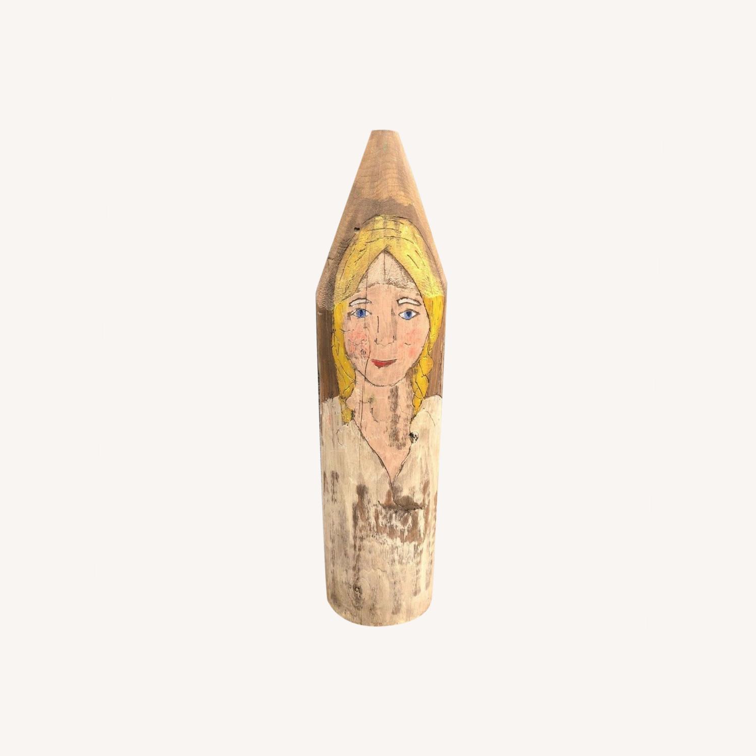 Seller's Notes:A solid piece of carved wood painted with a compelling portrait of a woman with braided blonde hair. The sculpture showcases the creativity of a talented self taught artist or naive art maker. With a refined style through personal experience rather than formal artistic training it is a unique piece rarely encountered in an artwork.