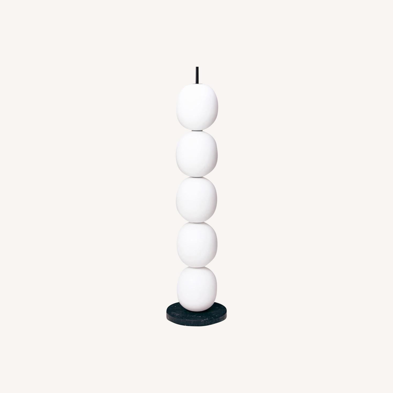 Seller's Notes:Designer Sebastian Herker's Mainkai Floor Lamp is inspired by the spherical fishing floats and mooring buoys that bob along the river in Frankfurt, Germany near the desinger's home. The beautiful glass globes and rich Italian marble base provbide an elegant yet modern look for any room. The lamp is dimmable LED and in excellent condition. Design: Sebastian Herkner Material: BASE: Black Marble FRAME: Powder Coated Steel-Noir de Fumee / Powder Coated Steel-Black SURFACE: Opaline Shade LED Dimmable / 18W, 1800 Lumen, 2700K Dimensions: 121cm H x 30cm Diam / 47.6" H x 11.8" Diam Handcrafted in Italy