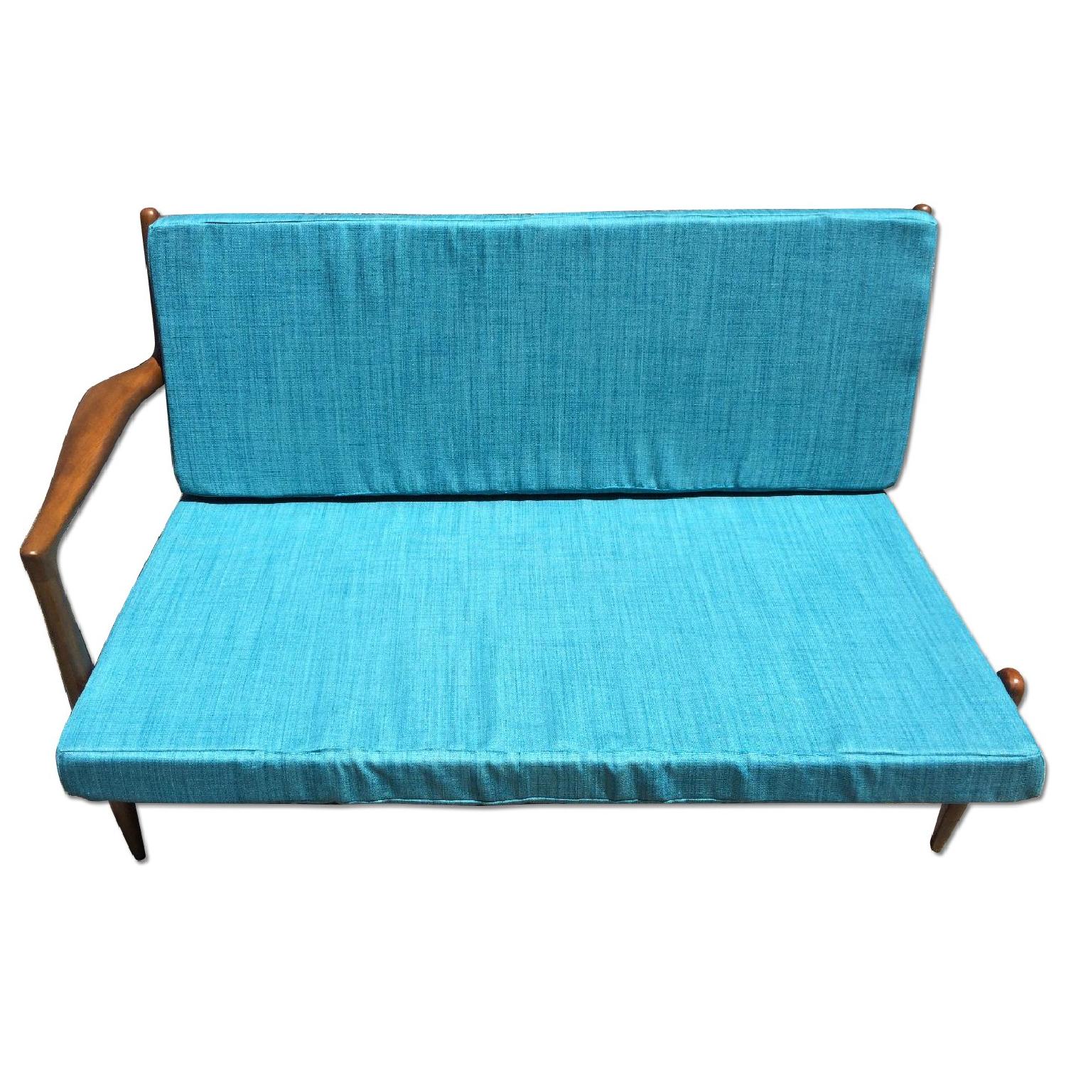 Seller's Notes:Lovely sofa by Selig from the 60's. In excellent condition with new straps and new upholstery. Sofa has one arm meant for a side table at the end without the arm. Size 48" x 32" x 27" high