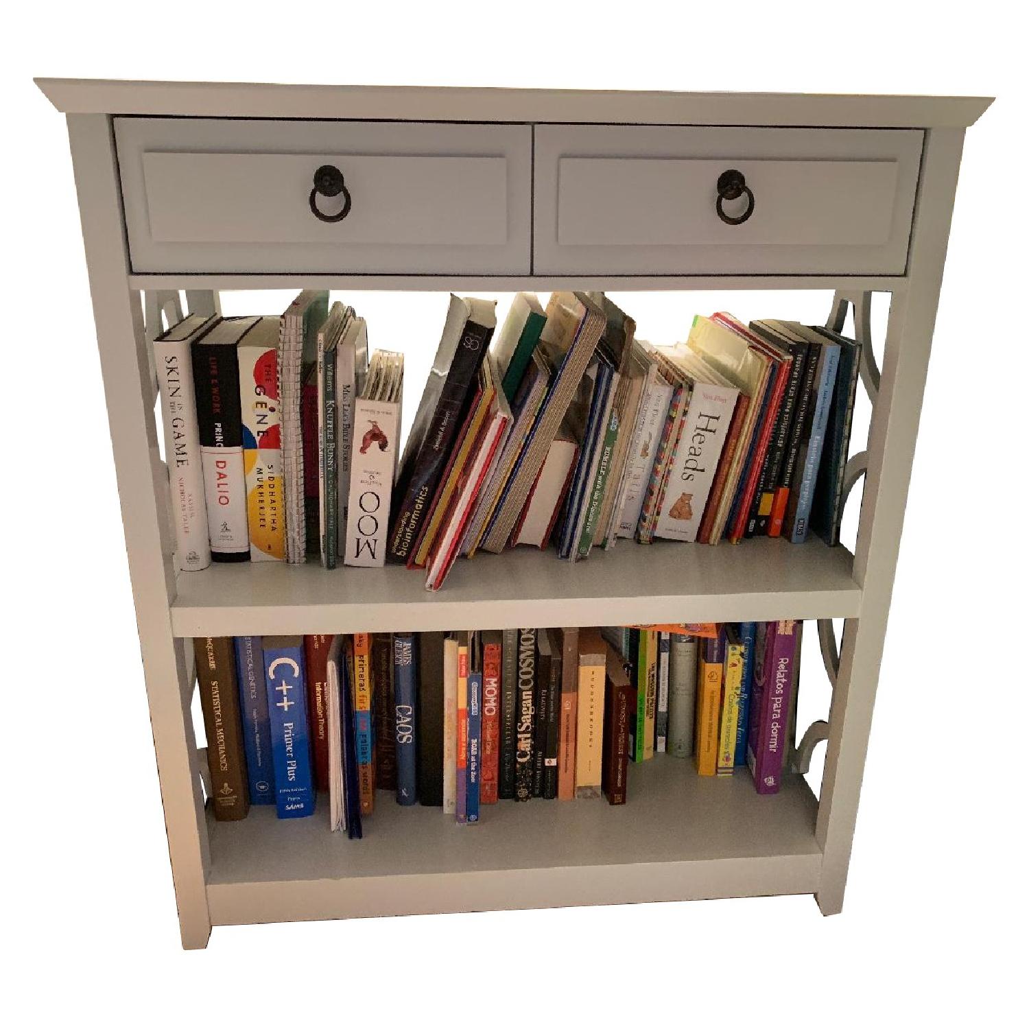 Seller's Notes:Serena and Lily light blue lower height bookshelf with drawers. Add a hint of glamour with a classic piece that will last through the years. This trellis bookcase is the perfect example. Perfect for a narrow entry way or nyc apartment living.