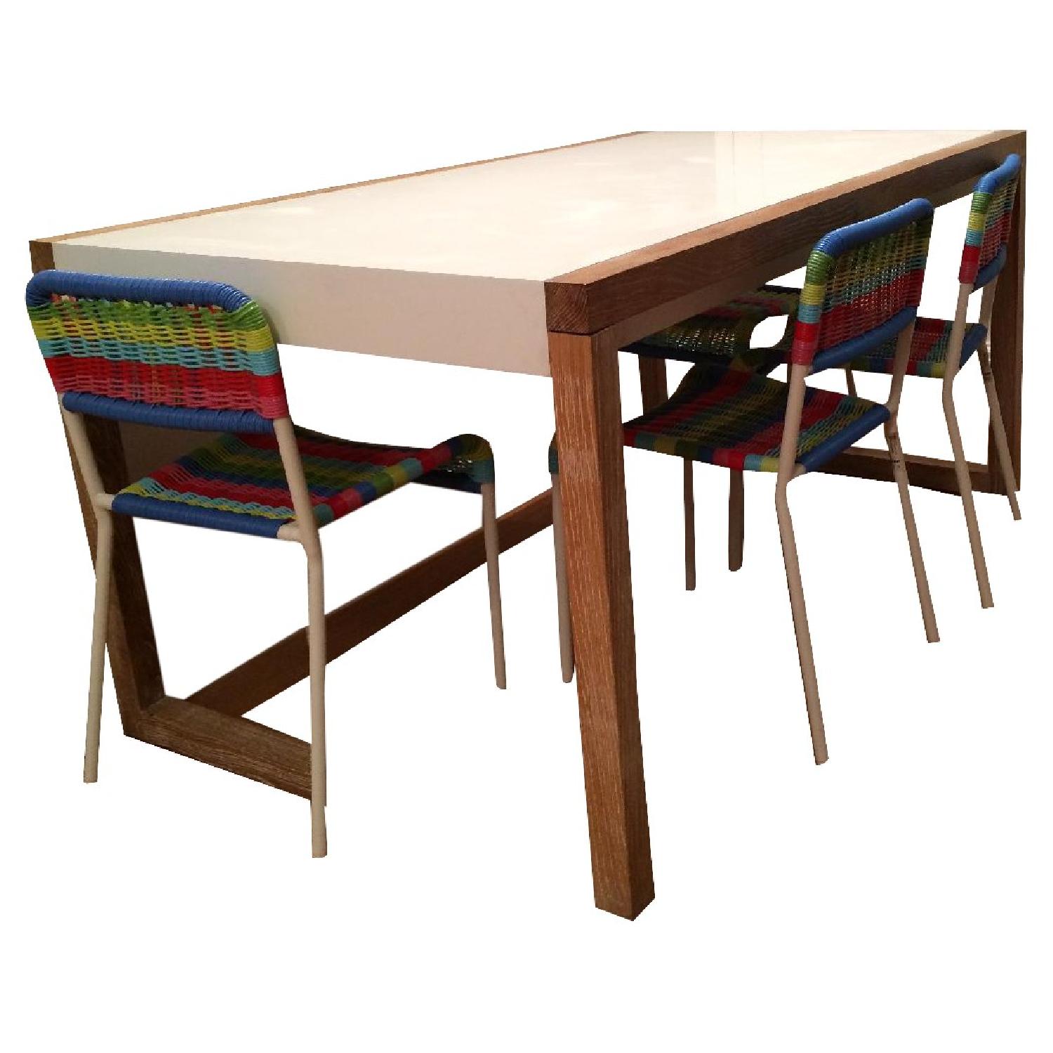 Seller's Notes:Serena and Lily white children's play table and 4 stacking IKEA Faarglad rainbow chairs that fit neatly underneath. This is the link to the chairs, new: http://www.ikea.com/us/en/catalog/products/00101056/ The lark play table isn't on the Serena and Lily website anymore. My kids did art on it for 2 years so the surface has some wear and tear. Otherwise table in great shape though.
