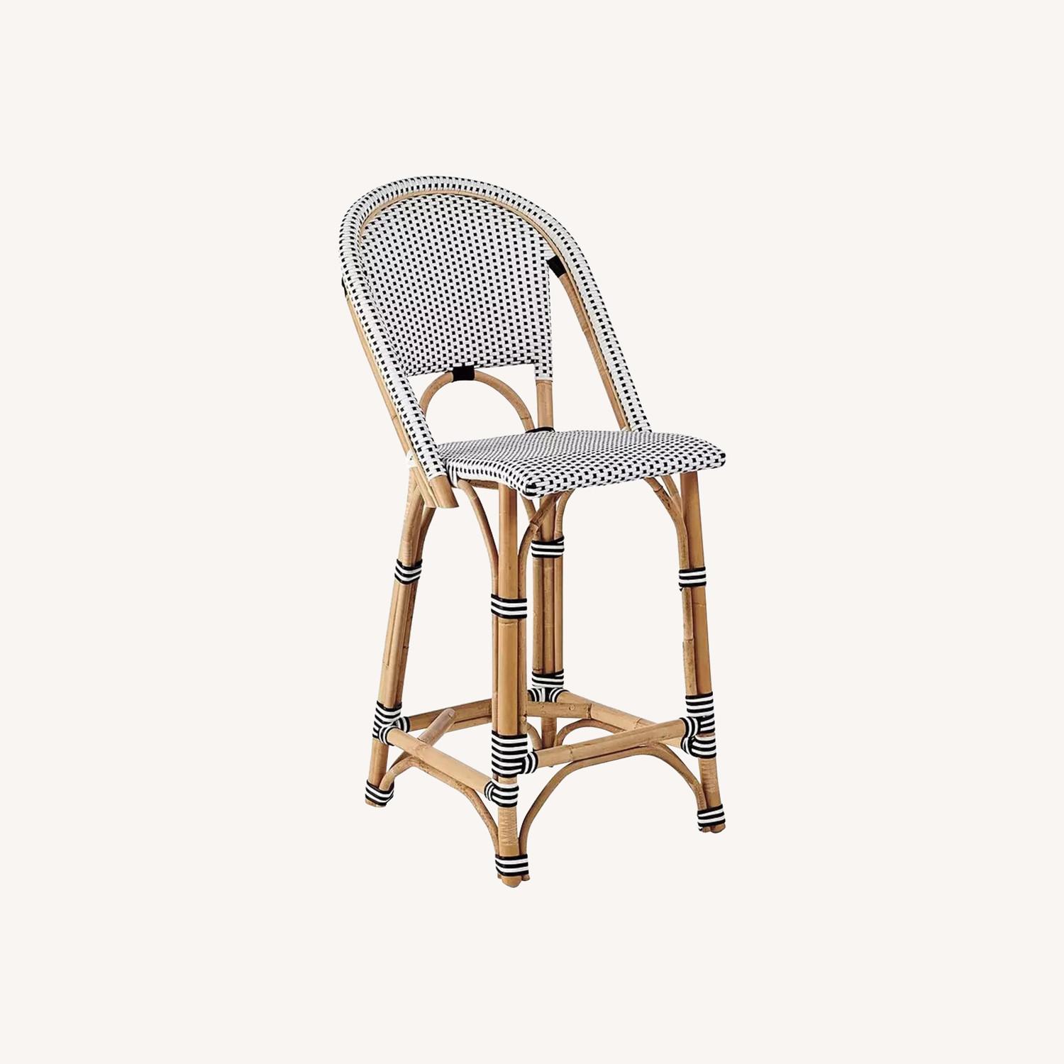 Seller's Notes:Set of 2 counter stools. Black and white Ratan. 26” seating height