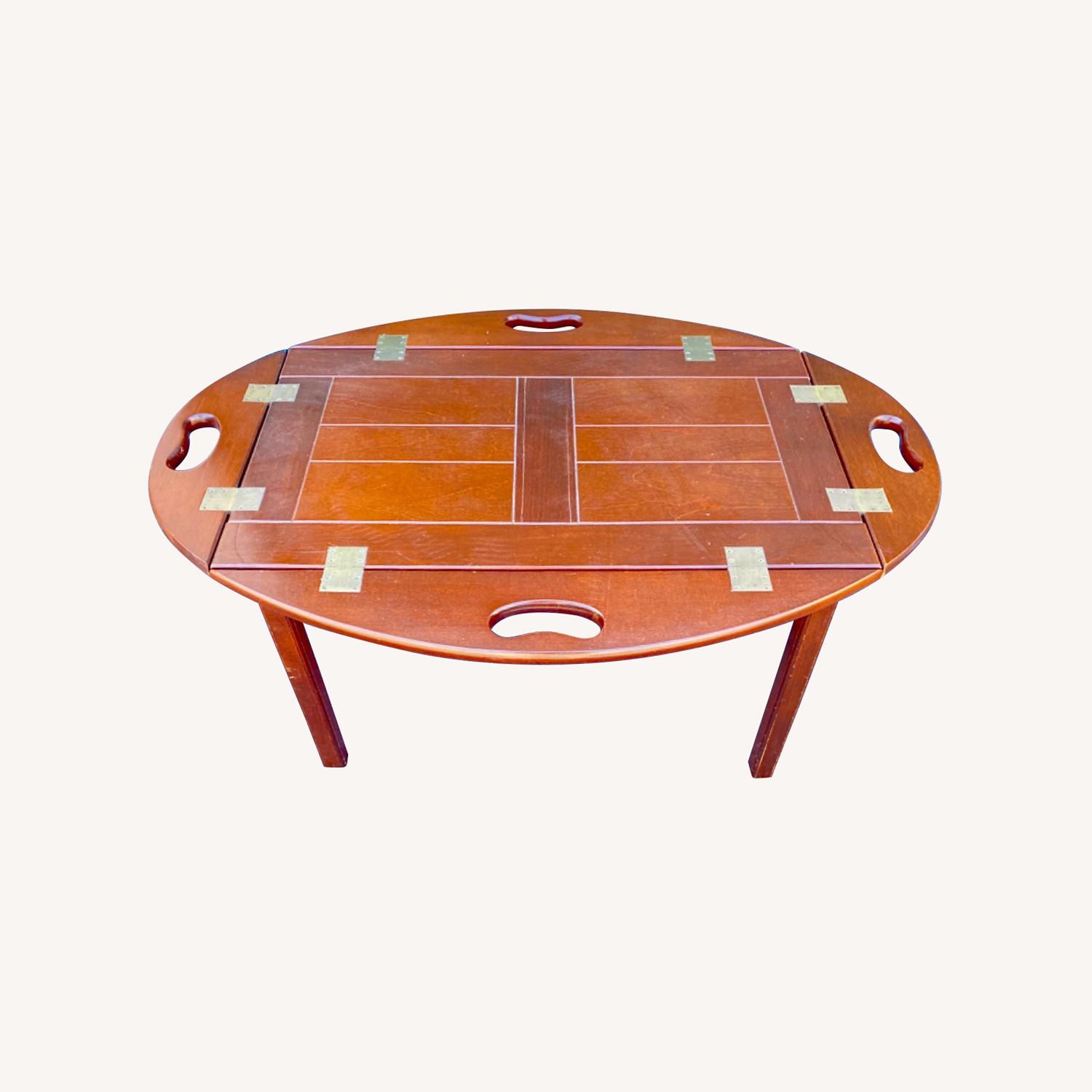 Seller's Notes:Dark Wood Serving/Coffee Table with removable top and brass hinges.