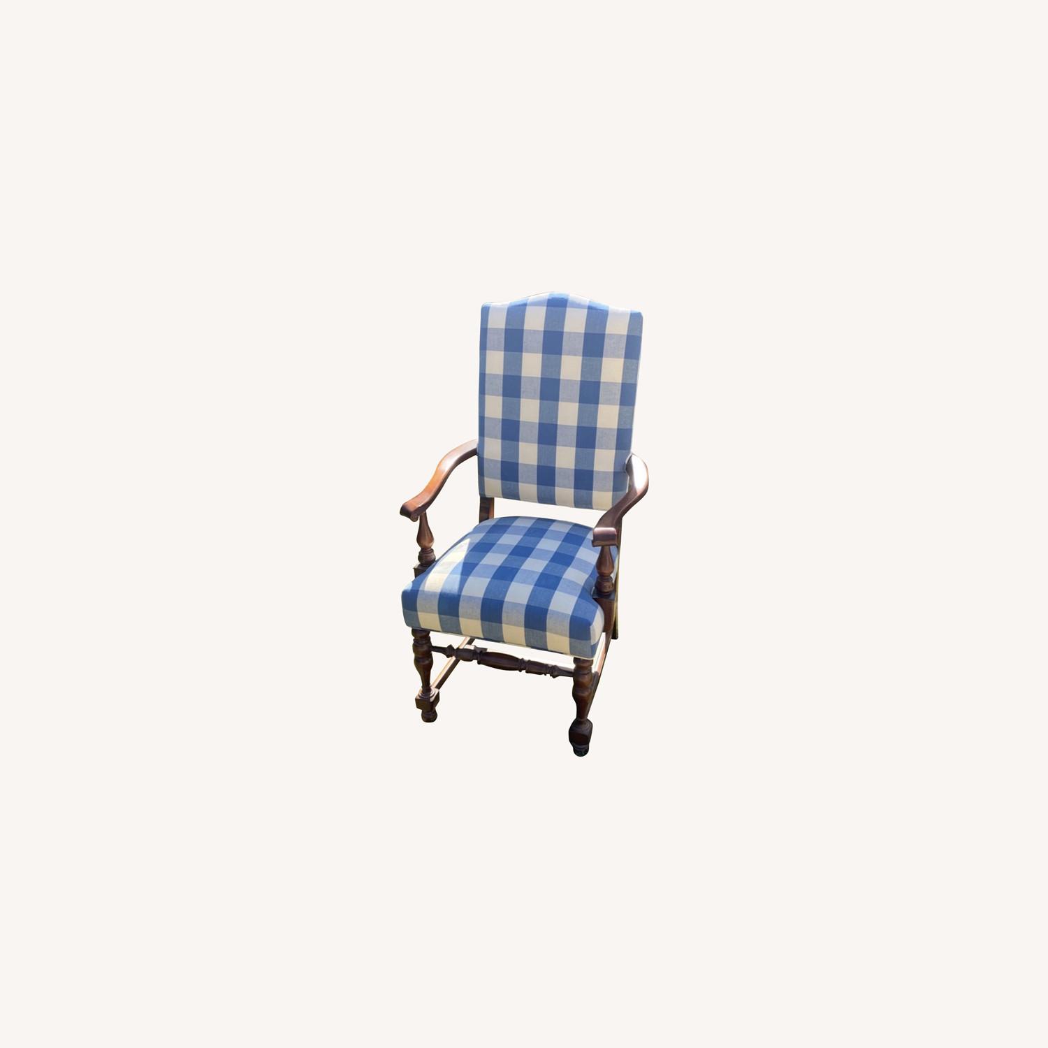 Seller's Notes:Formal dining room chairs from our Hamptons country home. Custom upholstered in a blue and white check pattern, linen-look fabric. Outstanding quality -designer purchased from The Charles Stewart Company. Very comfortable and perfect for elegant traditional styling. Set of 12 includes 2 arm chairs and 10 side chairs. Real wood. Rarely used an no noticeable imperfections.