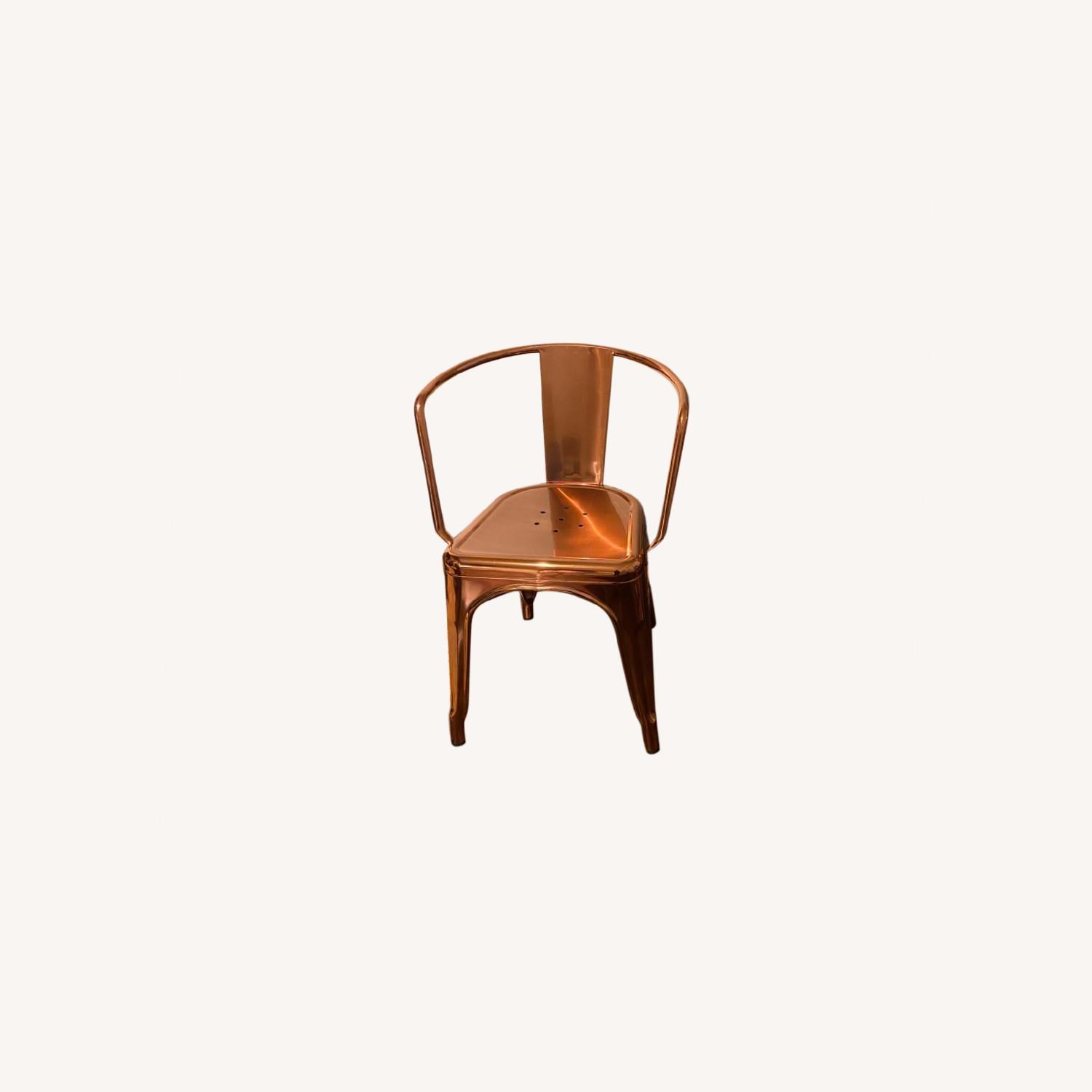Seller's Notes:These metal dining chairs bring an industrial chic look to your space while giving you a comfortable place to sit whether you're having a quick breakfast or settling in for dinner. The simple factory-style kitchen table chairs will blend seamlessly with any decor style your home already has, giving you lasting use for years to come. Overall Height: 28 inches Overall Width: 20 inches Overall Length: 19 inches Armrest Distance: 20 inches Two Back legs Distance: 14 3/8 inches Seat Height: 17 inches Seat Depth: 13.5 inches Seat Width: 14 inches There is a bit of minor wear on the finish in a few small spots on the back of the chairs, see photos.