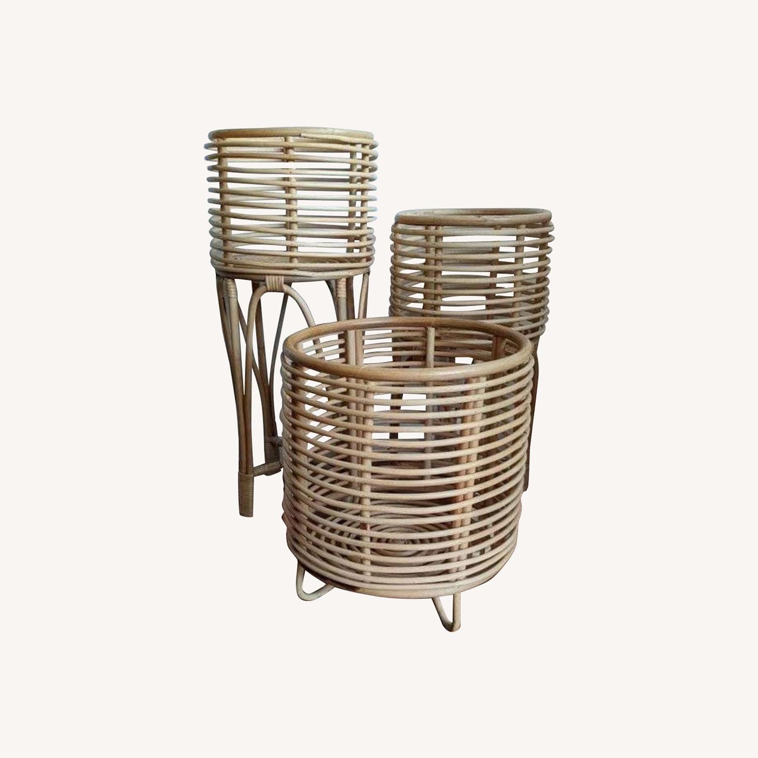 Seller's Notes:Selling THREE rattan plant holders as a set. Dimensions are as follows: Large planter dimensions: 15" wide by 18" tall Tallest planter: 12" x 29" Middle: 12" x 24" Slight natural discoloration at the bottom of the shortest, wide holder (see image) but otherwise in great condition and very stable.