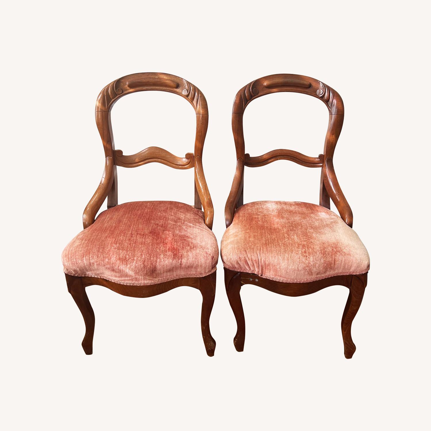 Seller's Notes: Add a touch of retro charm to your dining space with this set of 4 vintage dining chairs from 1984. Featuring original dusty rose velvet-look upholstery and sturdy wooden frames, these chairs bring a warm, nostalgic vibe to any room. The soft fabric has a subtle sheen, giving it a refined yet cozy look. Whether you're going for mid-century, eclectic, or vintage glam, these chairs make a stylish and functional addition to your home. There is minor wear consistent with age. Upholstery has varied signs of fading and wear (as seen in the images of the chair top), but still looks great. Frames are sturdy with light surface wear, such as scuffs and scratches. One of the chairs has been repaired in the past, as indicated by two screws on the frame (see pic). They have been a lovely addition to our home. Hope the next owner enjoys them as much as we have.