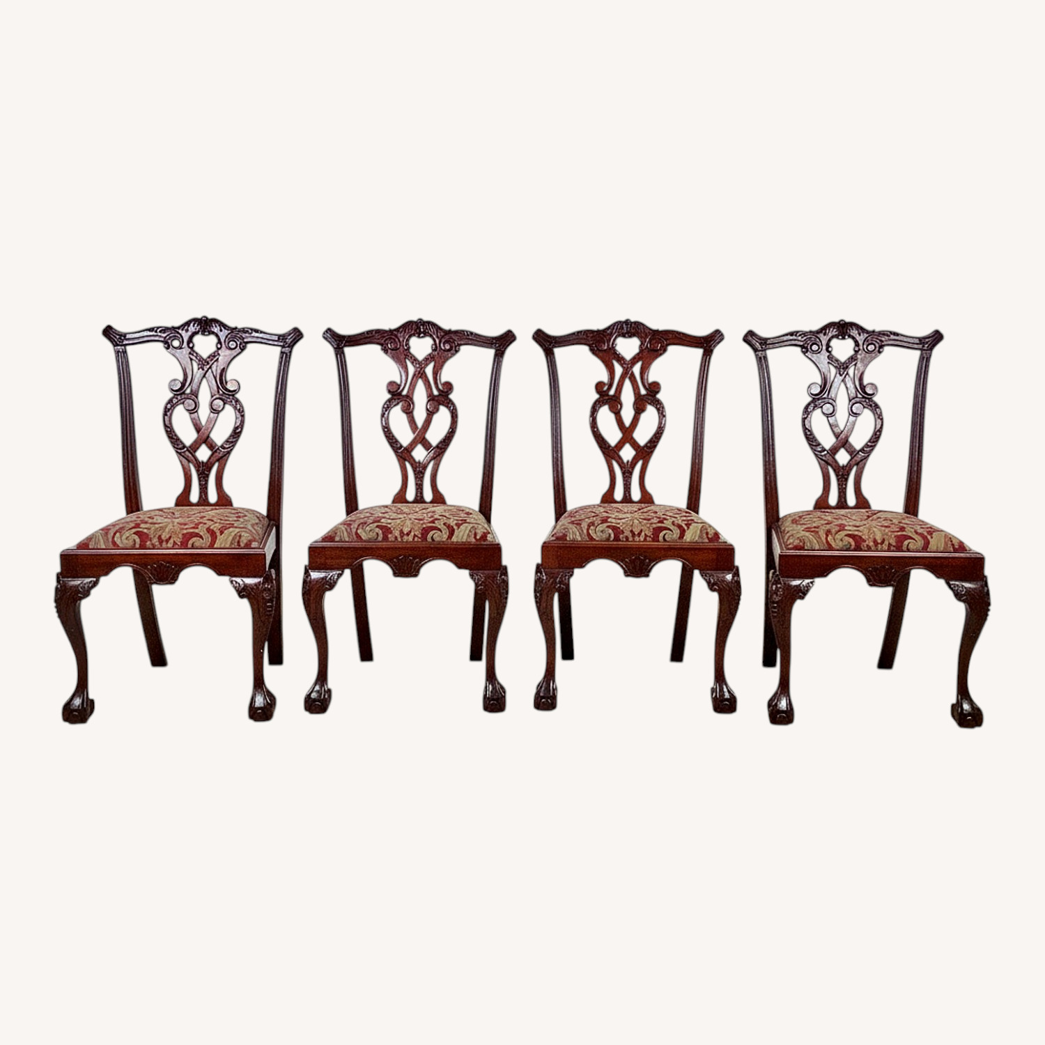 Seller's Notes:A well-matched set of six Chippendale-style mahogany dining chairs with exceptional carved detail throughout. Each chair features a pierced vase-form splat back with scroll and acanthus carving, a carved serpentine crest rail, acanthus-carved cabriole front legs, and deeply sculpted ball-and-claw feet. Upholstered slip seats in a burgundy and sage damask pattern. All six chairs are structurally sound and consistently matched. The carving quality is the standout feature of this set — from the elaborate open-pierced splat work to the flowing acanthus knee carvings and the confident grip of the ball-and-claw feet. The Chippendale style has been produced in quality revival versions throughout the 19th and 20th centuries; this set exhibits the depth and consistency of carving associated with quality production. Precise period attribution would require hands-on examination, but the decorative power and quality of execution are unambiguous. A significant and decoratively commanding set for a formal dining room. Pairs naturally with Chippendale, Queen Anne, and other traditional dining tables, and equally well with maximalist and eclectic interiors that embrace historical ornament. Sold as a set of six. Style: Chippendale. Material: Mahogany; upholstered seats. Set of Six Dimensions: 23w 21.5d 40h 20sh Condition: age appropriate wear, finish worn, scuffs/scratches, edge wear, see photos.