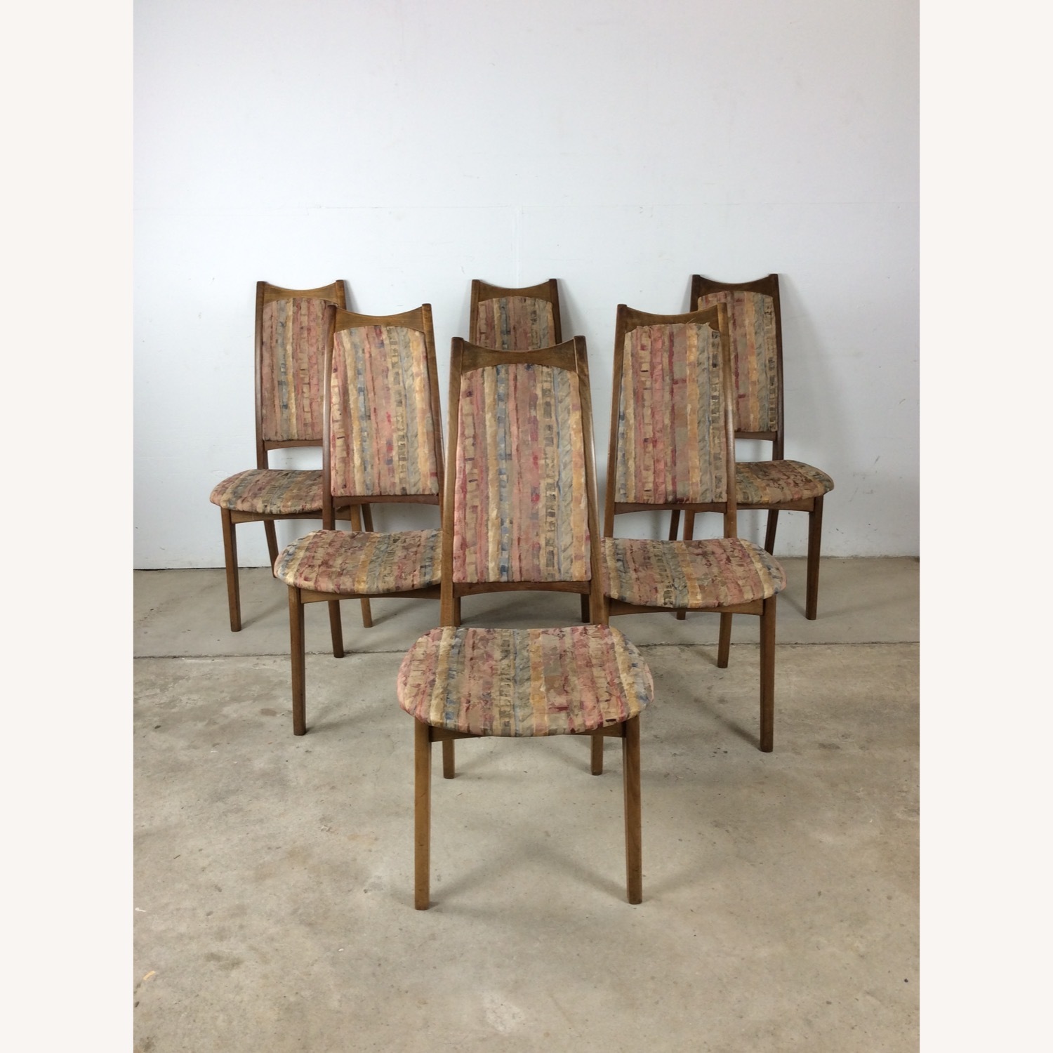 Seller's Notes:This set of six mid century modern dining chairs features hardwood construction, original walnut finish, six identical style chairs, vintage floral upholstery, and tall tapered legs. Matching dining table is available separately. Dimensions: 18.5w 23d 39.5h 18sh Condition notes: Original walnut finish has some staining, small scuffs, scratches, edge dings, and kick marks on legs. The chair frames are sturdy with many good years left in them. Vintage upholstery could use a refresh. The cushions on the seats are worn and somewhat flat. The floral, dated fabric shows staining and fading from age and use. These chairs are an excellent candidate for restoration. 8/10